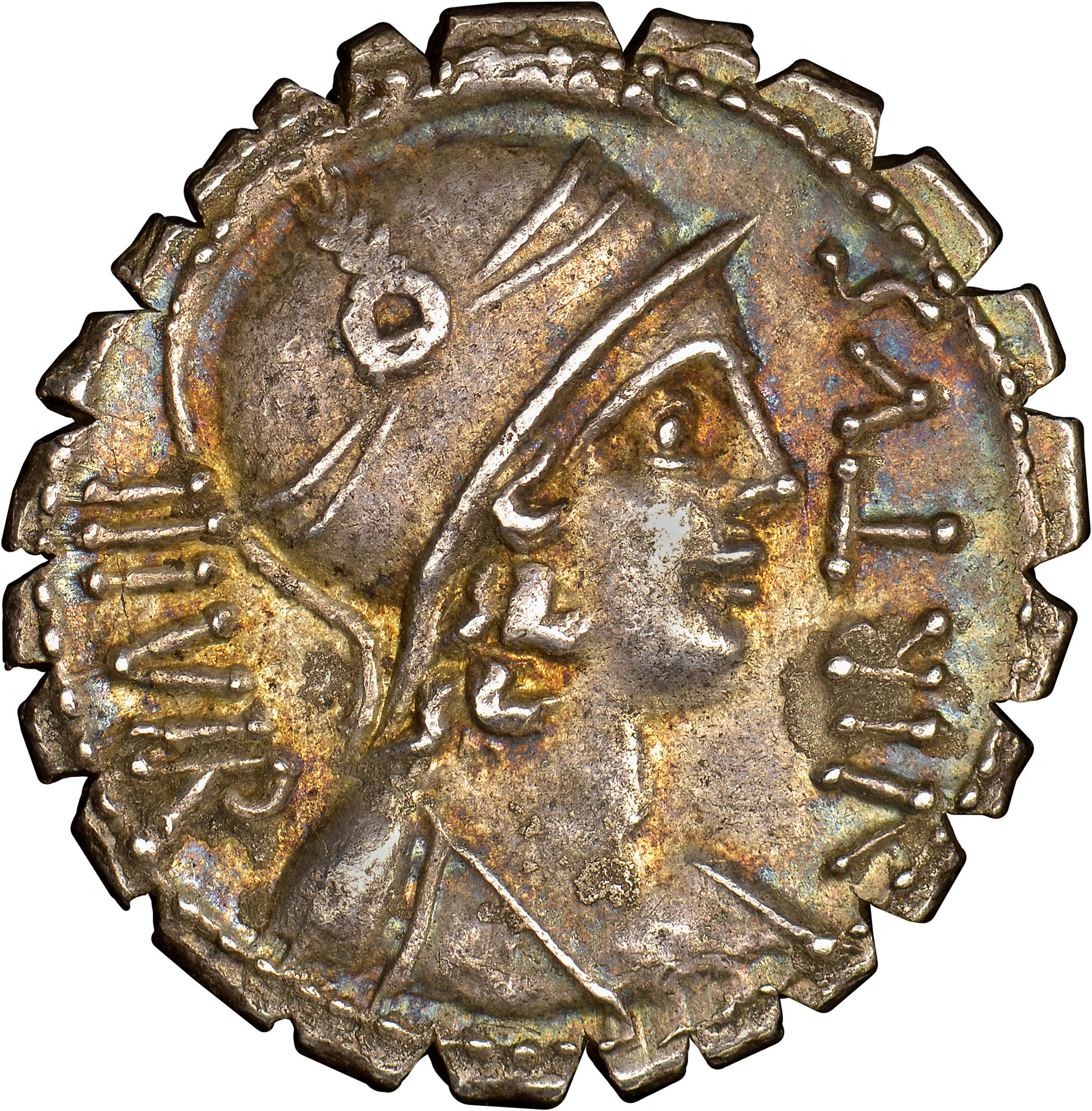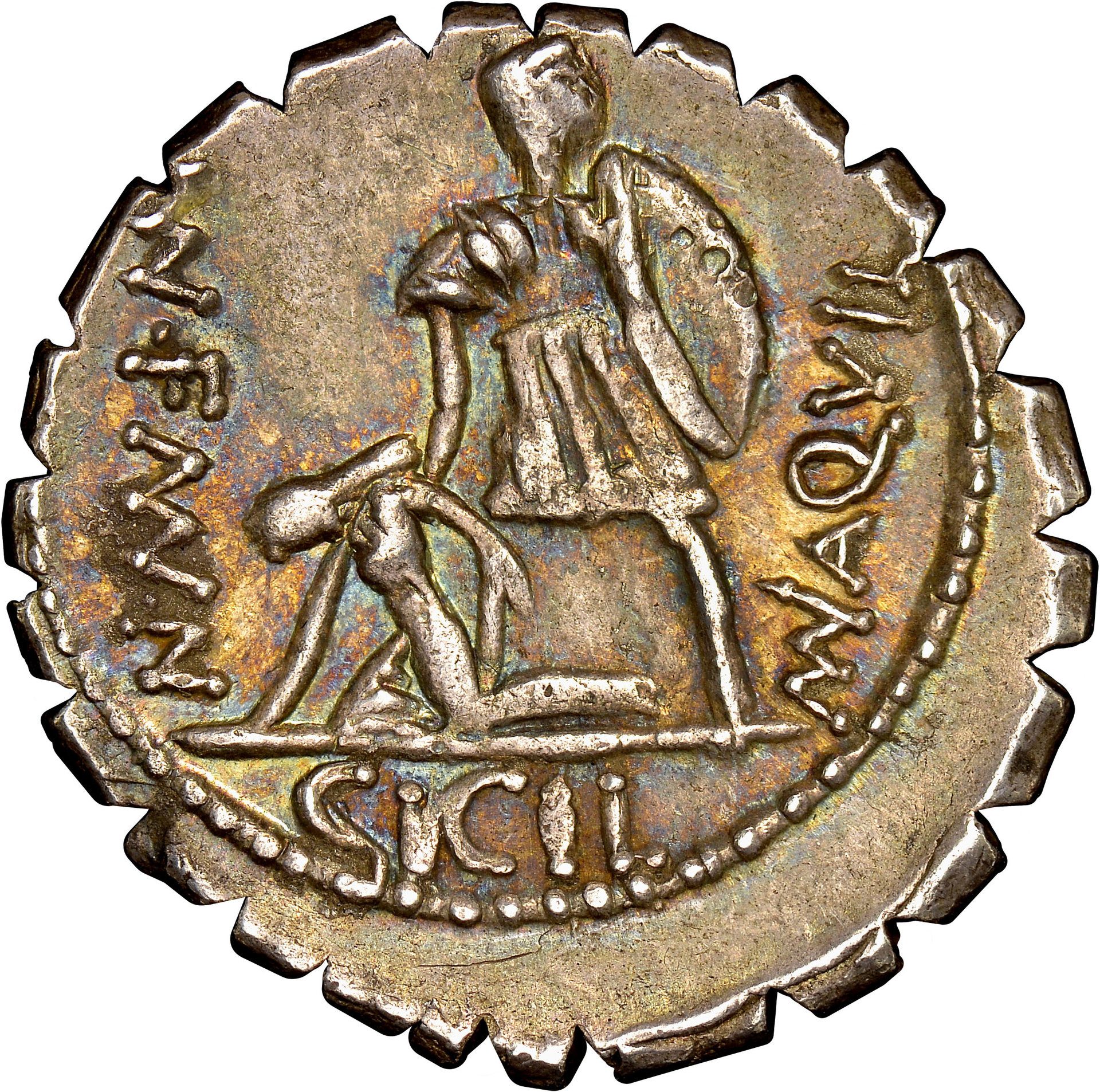 ROMAN REPUBLICAN. Manius Aquillius. Struck circa 71/65 BC. AR Denarius Serratus. NGC AU (About Uncirculated) Strike 5/5 Surface 4/5. Rome. 3.81gm. VIRTVS III VIR / MN•AQVIL MN•F•MN•N. Helmeted and draped bust of Virtus right / Warrior holding shield in left hand and lifting up fallen figure of Sicilia with right; SICIL in exergue. Sear 336; Cr401/1; Syd 798. Link to my other ancient: https://www.cointalk.com/threads/couldnt-help-posting-this-beauty-again.303083/#post-2855817