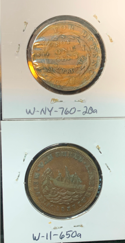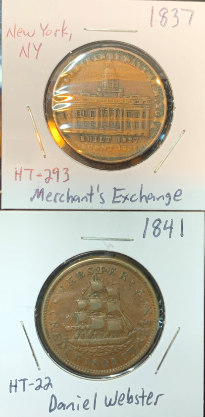 It's @lordmarcovan fault. He showed a 1915 Panama Pacific gold coin the other day, so I ventured to a local coin show hoping to come across one with the cash to buy it, if priced right. It was on my list of coins to acquire which I stopped buying probably 9 years ago. But none were at the show. but I did pick up a few: On my "get" list was the 1924 Huguenot, along with a few civil war tokens that I don't have. The light & plastic cover messed up the 1837 Merchant's Exchange image .. it's not that bad in person.