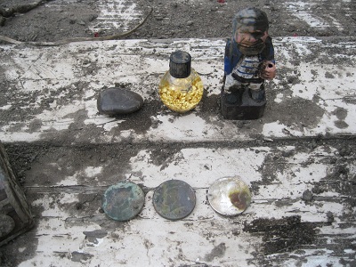 Hello collectors, Prepare for my long story, because Im pretty bad at writing these. When I was in the age range of 7-10 (I honestly cant remember) and my focus in life was pirates, I buried a small treasure chest with a whole random assortment of things, which until today I had forgotten about. Now Im 14, and a couple days ago out of boredom and a little motivation I decided to dig a small tunnel in my backyard. It was something I'd wanted to do for a while so I dug every day for about 2 hours, and got pretty deep (about 3 feet). I did remember about the treasure chest, which gave me a little extra motivation even though there was a 50/50 chance I had already dug the chest up, but did not remember doing so. All of this leads to today. I was working on expanding the hole to increase mobility, when I discovered a piece of decaying plastic on the side of the hole. I almost instantly realized what this was and quickly dug it out. I know I should of taken pictures of the chest in the hole, but I was way to excited. I took the tape, string, and plastic wrap off of the chest, and opened it. Here are the "spoils" A polished stone, vial of flake gold, wooden pirate statue, 2 clad Kennedy's, a 1964 Kennedy, and a semi-nice ring I remember feeling very guilty about burying (not pictured, as it is my moms so I gave it back to her) It appears like the clad halves which laid on the silver half transferred rust onto it. Also, out of excitement I rubbed the coin to see what date it was and unfortunately in the process gave it a few scratches. This is not nearly as exciting as finding a coin purse full of 1800's coins (Youtube video reference) but still enough to make your day Thanks for reading! P.S. I know this is a weird turn from the normal things you talk about in this forum, but since there were some Kennedy's in there I figured why not share the story.