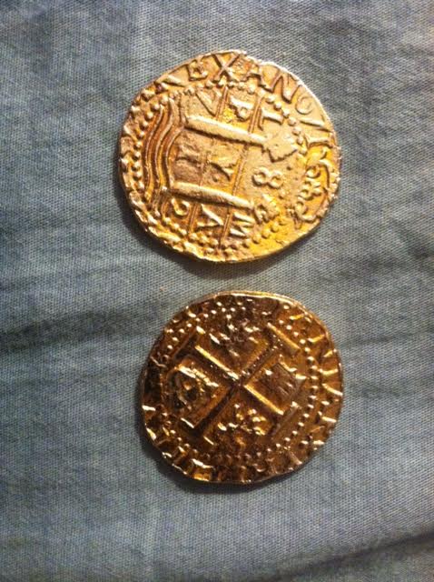 Those would be "Royal" cob 8 escudos and worth a fortune had they been real. However, they look like pretty obvious replicas to be. Weight and better photos would help to confirm that.