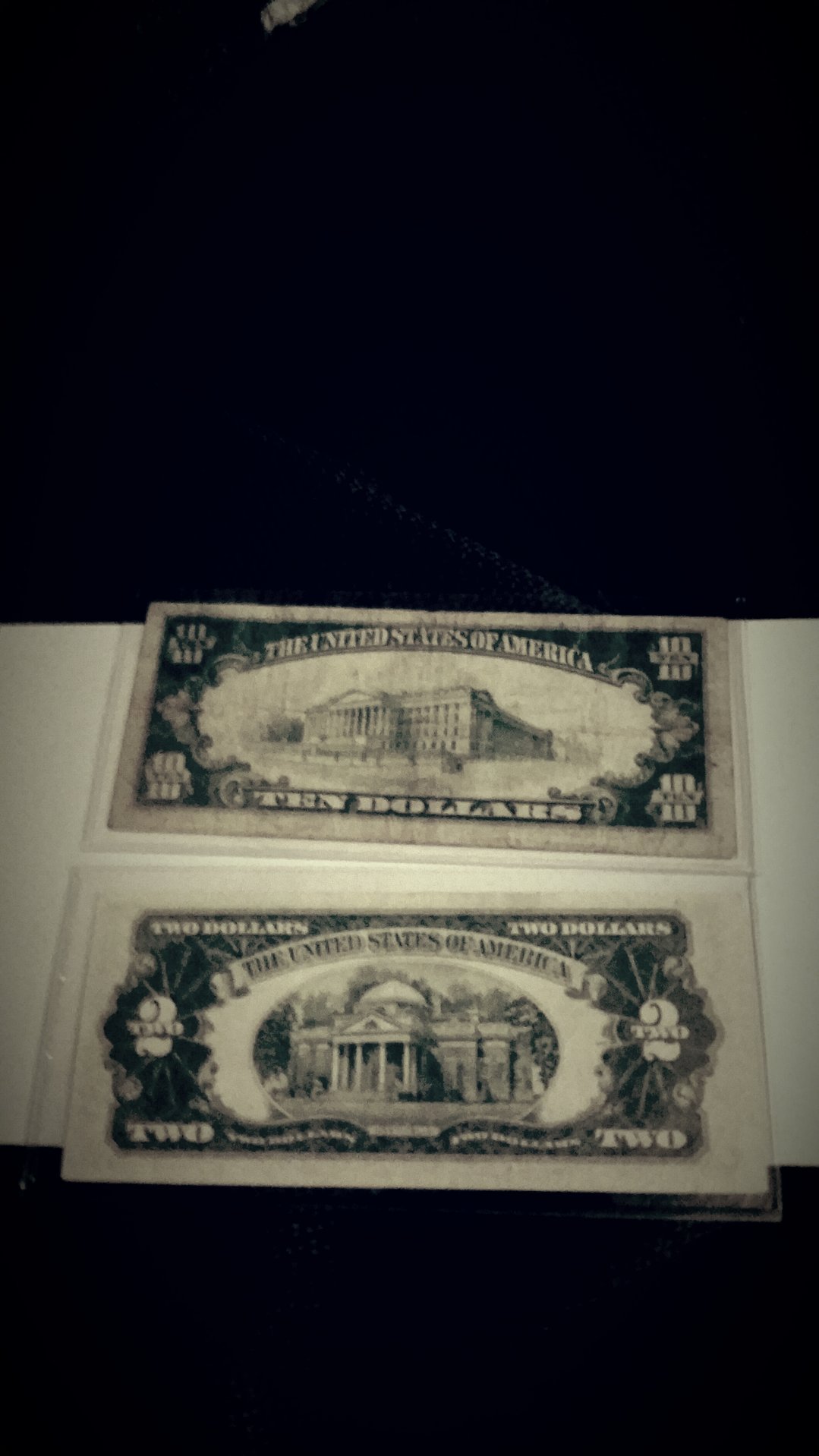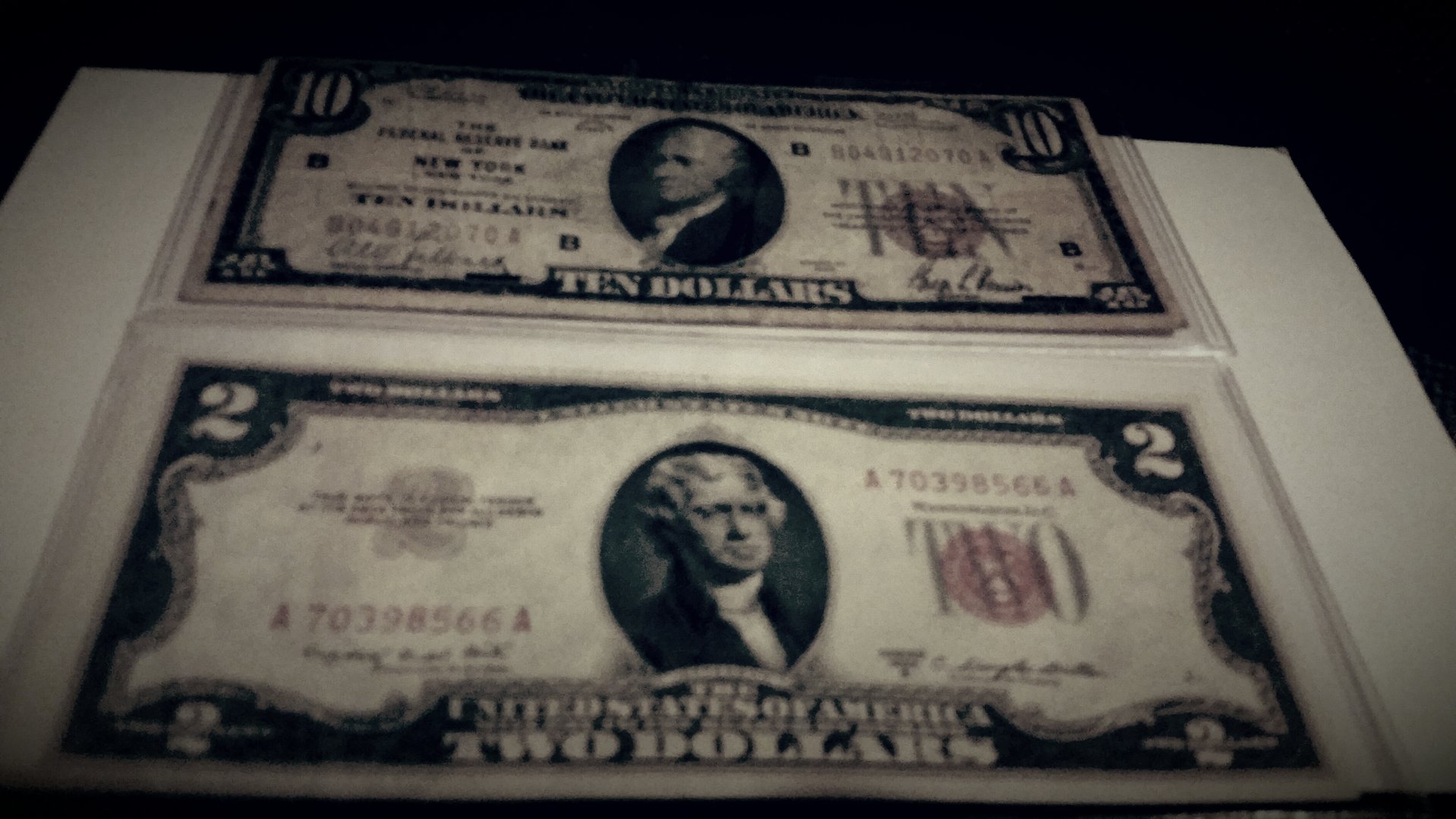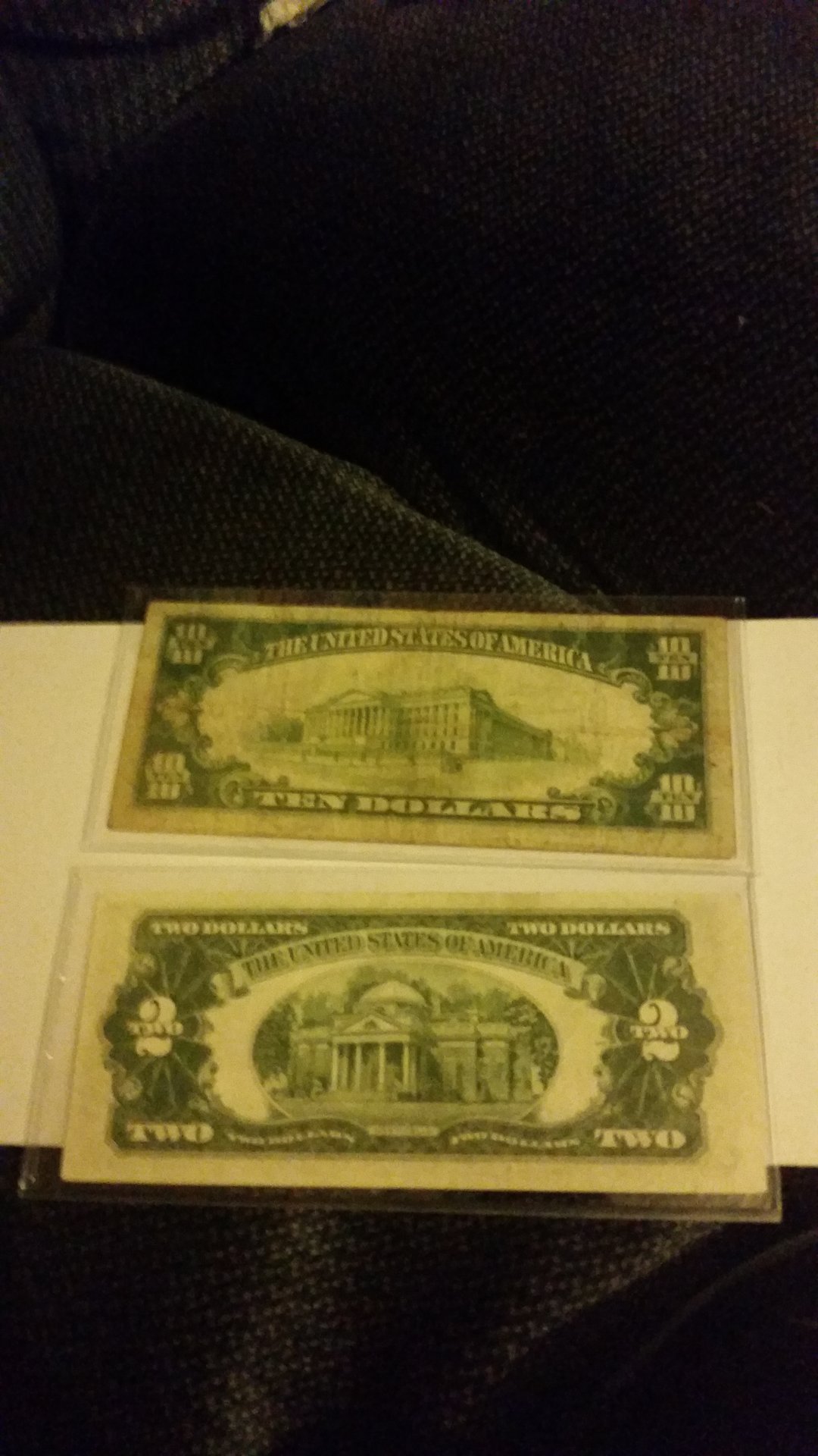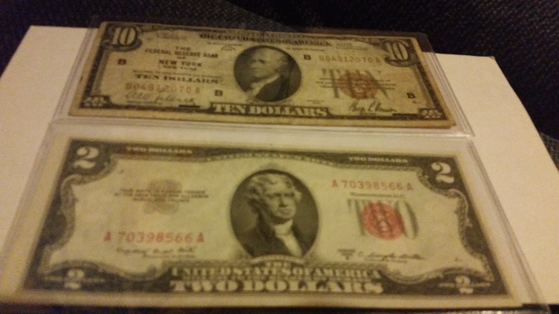 1929 Federal Reserve Bank New York Ten Dollar bill and 1953 B Two Dollar bill.