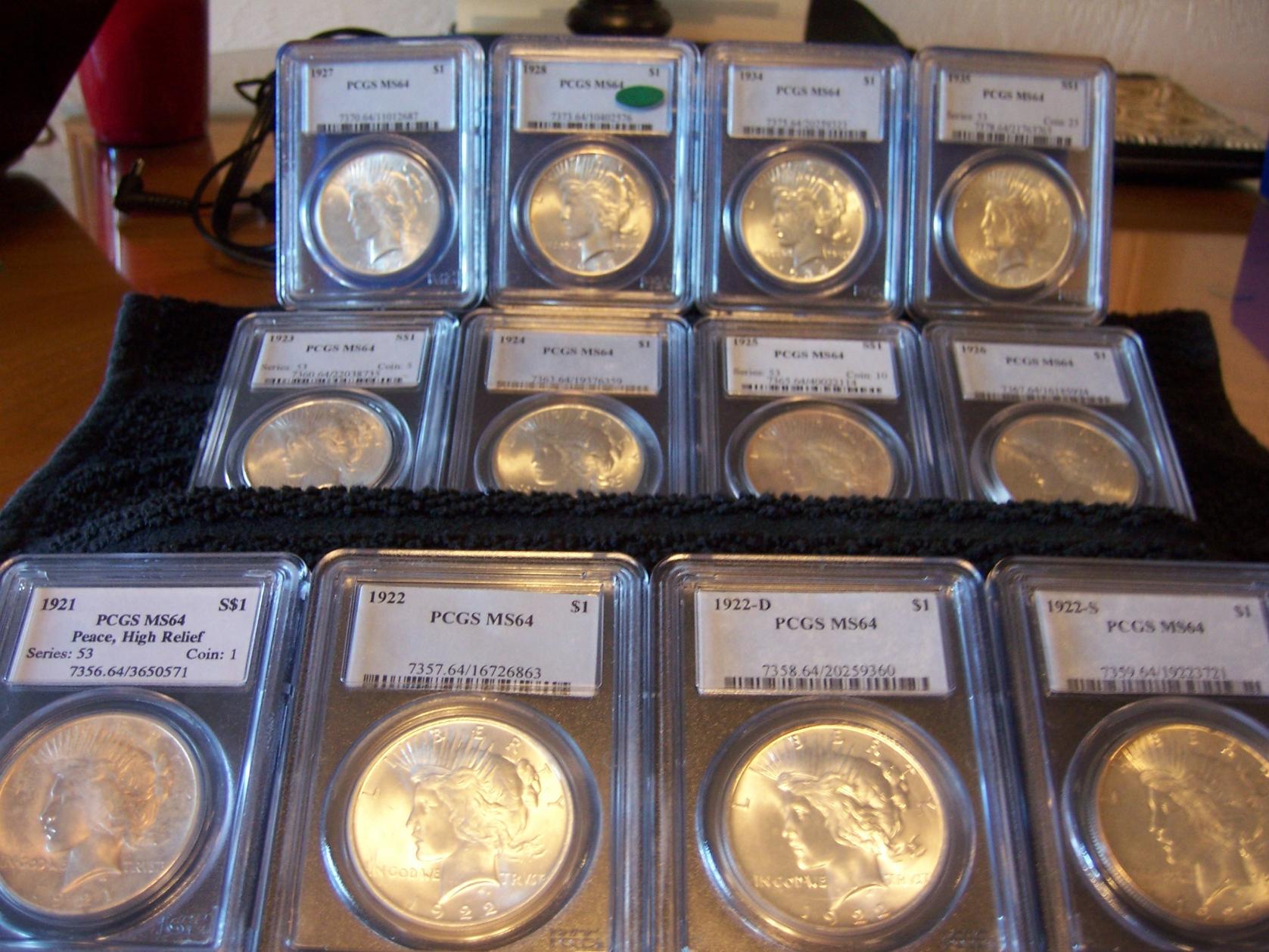 Sorry. . . Couldn't limit this to just 10 coins. My Peace Dollar PCGS MS64 collection. 1921, 1922, 1922D, 1922S, 1923, 1924, 1925, 1926, 1927, 1928, 1934 and 1935.
