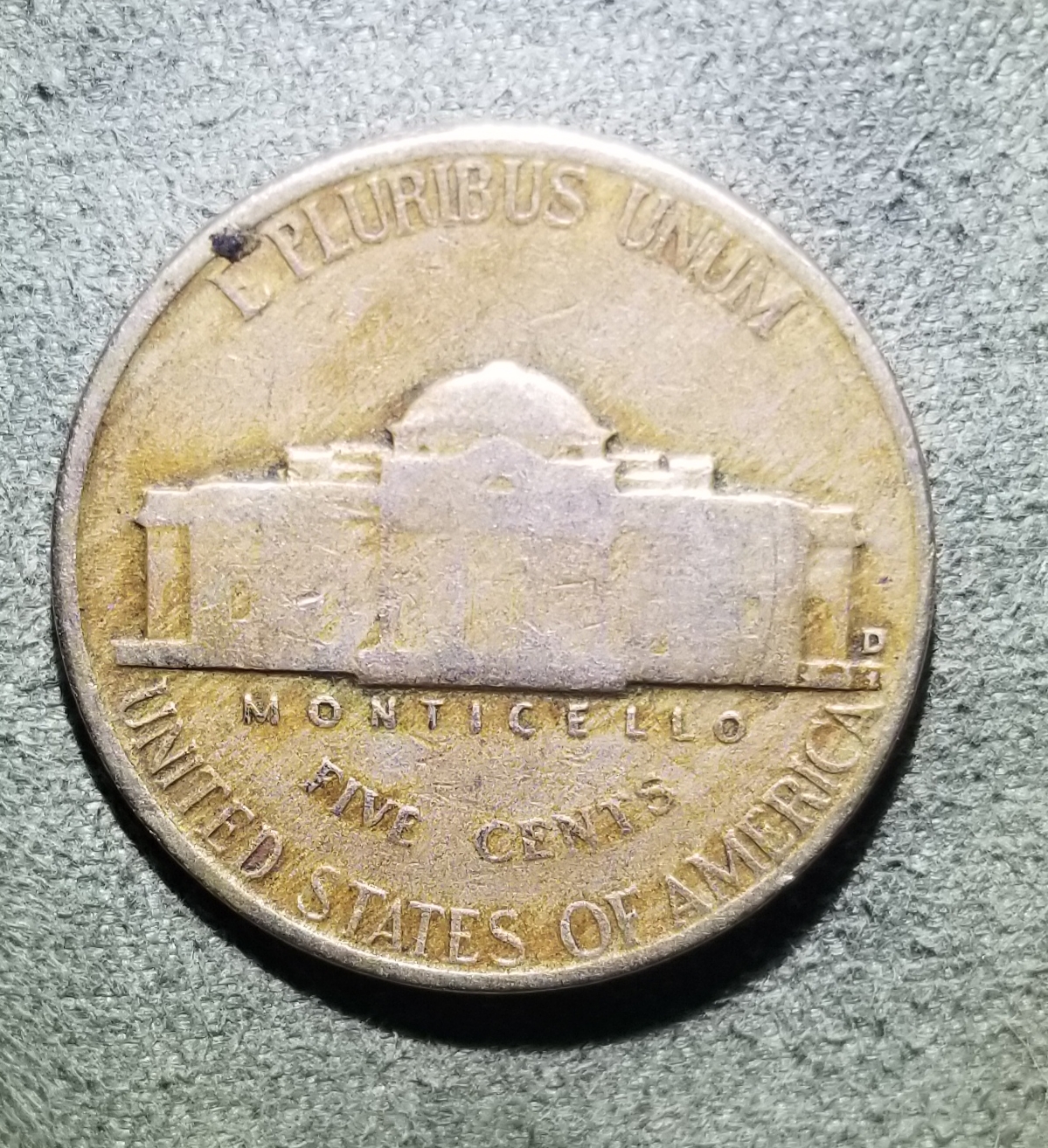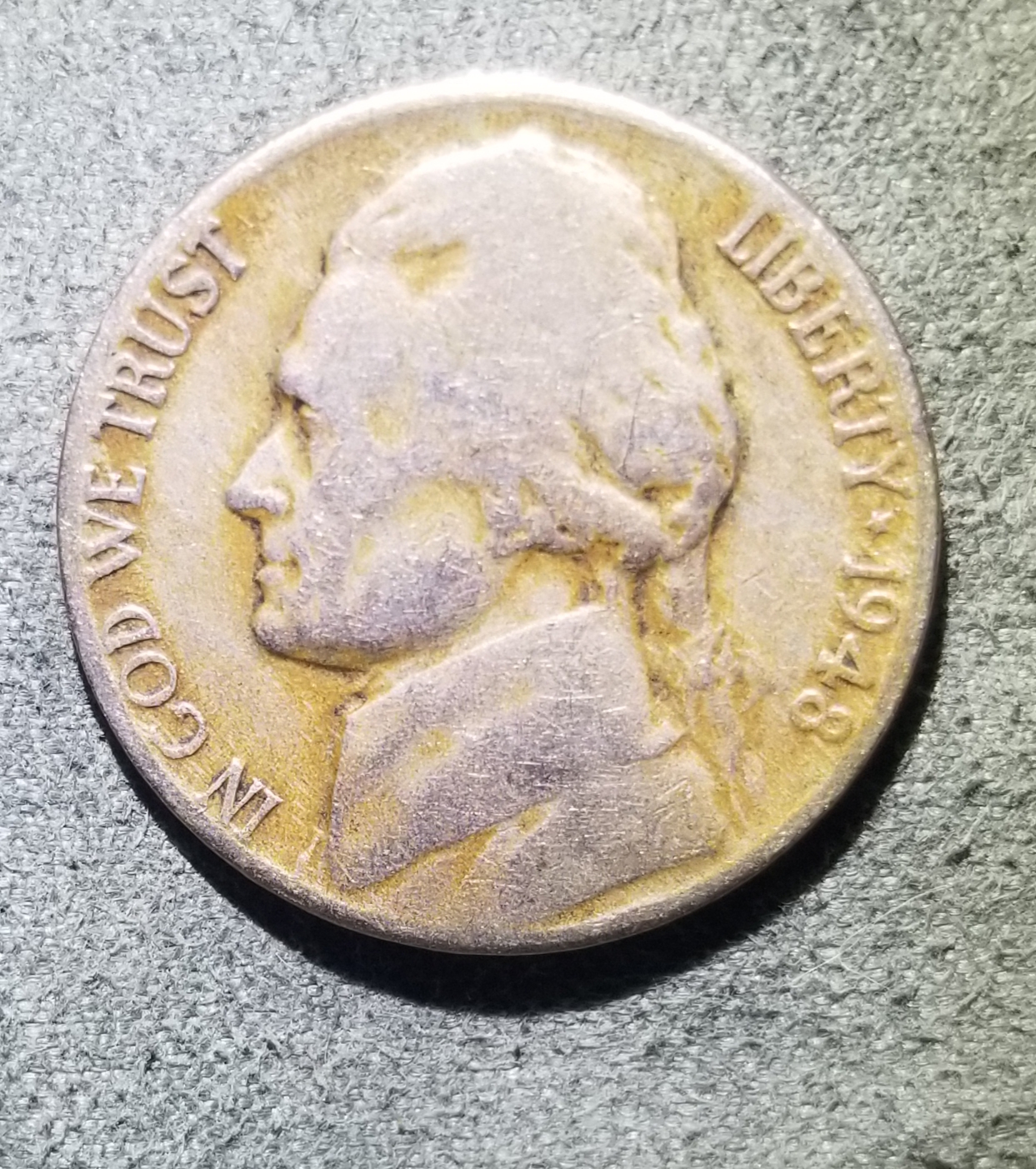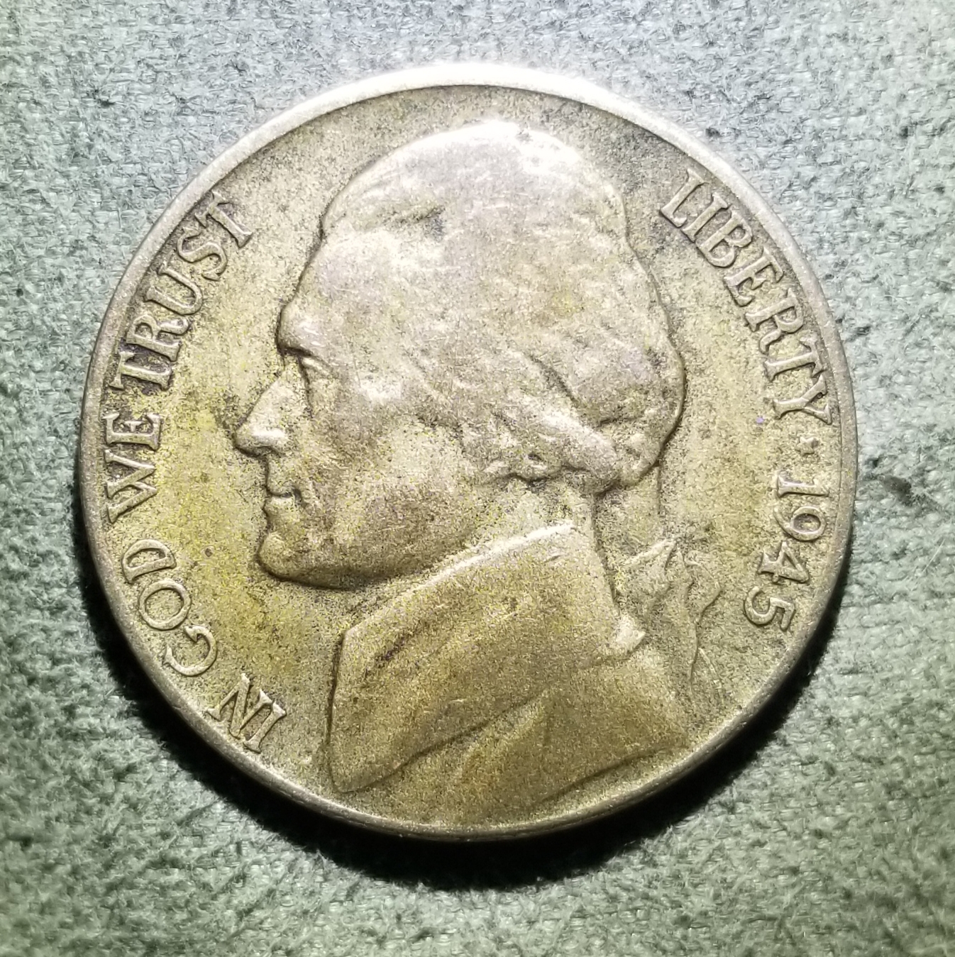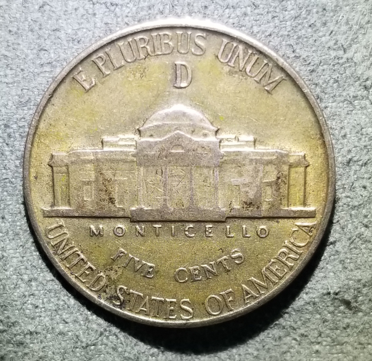 Old nickels just seem to tone. Many years in an album bring yellow and a bit of green. The silver war nickels turn dark a bit faster.