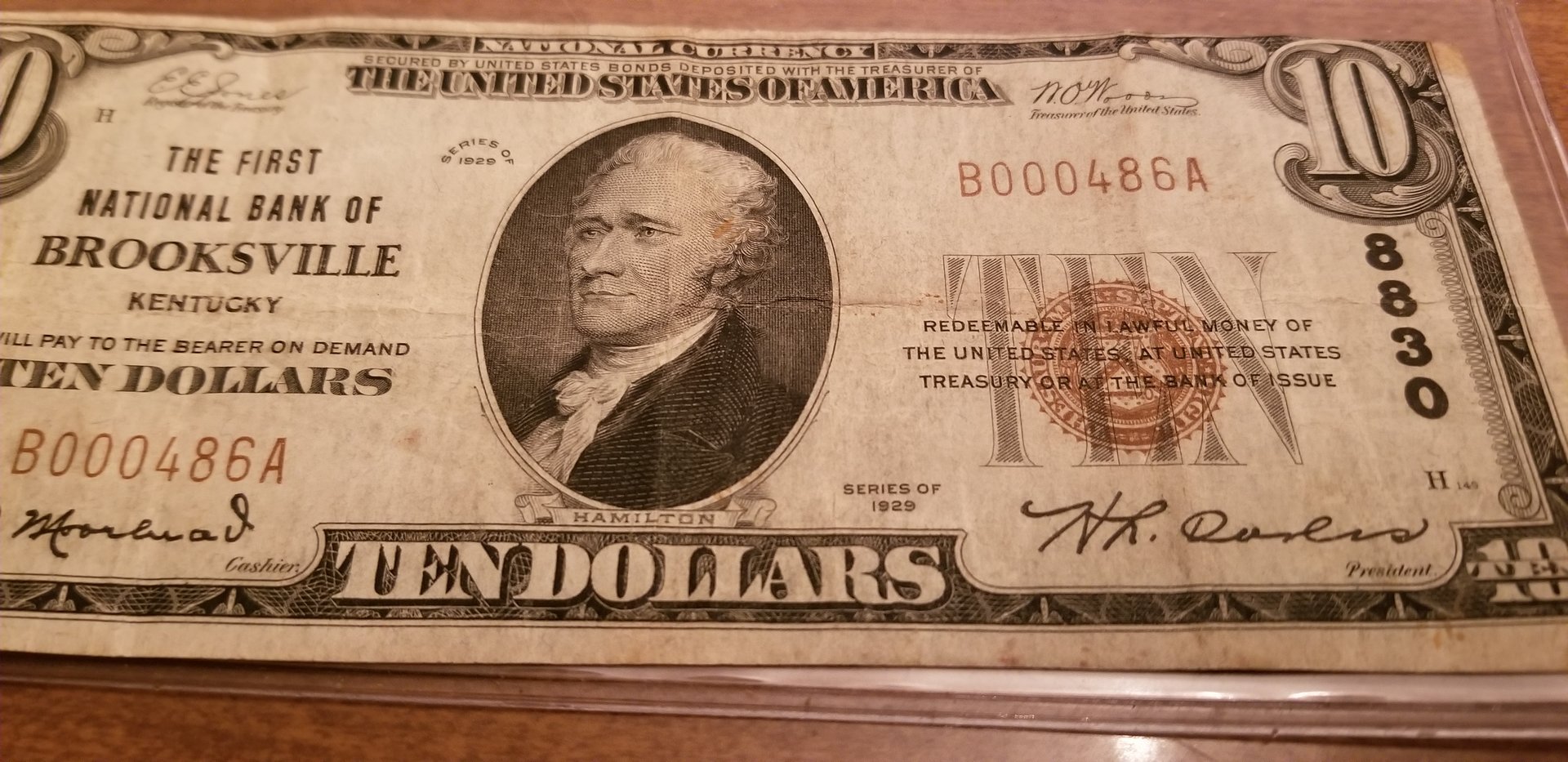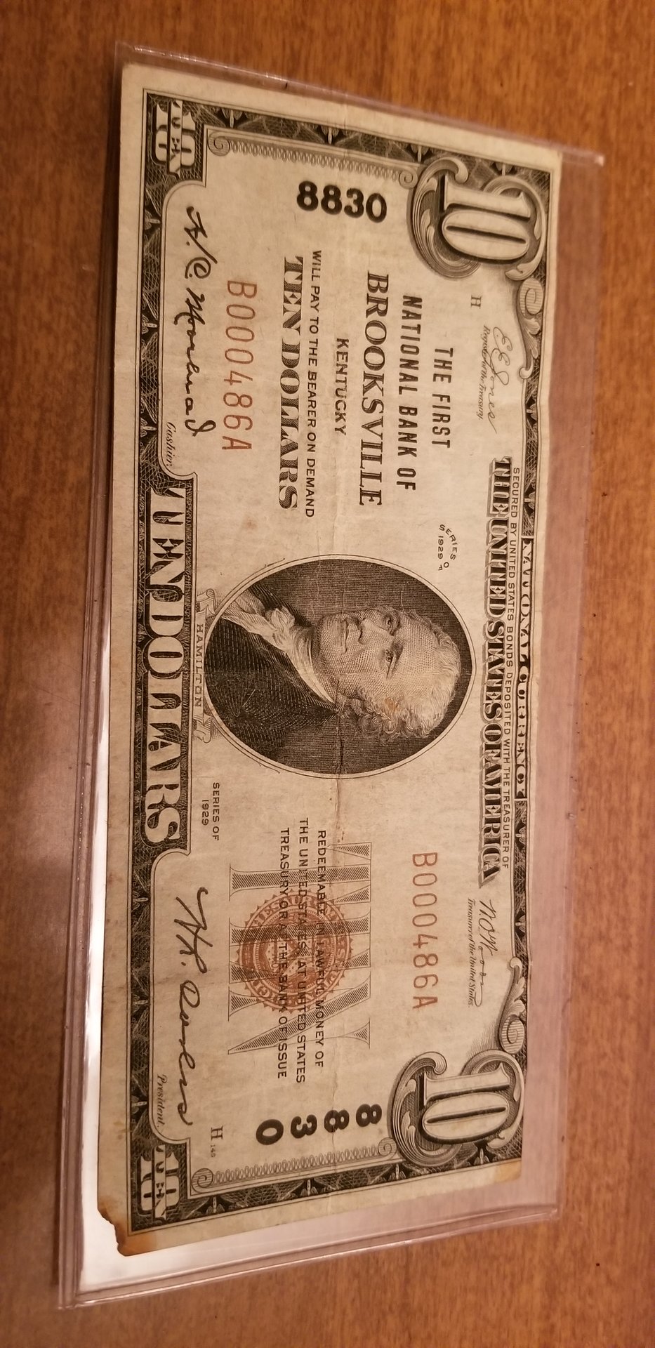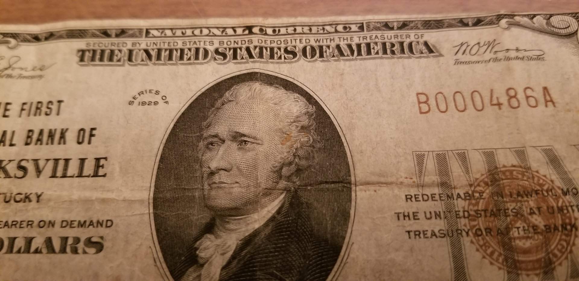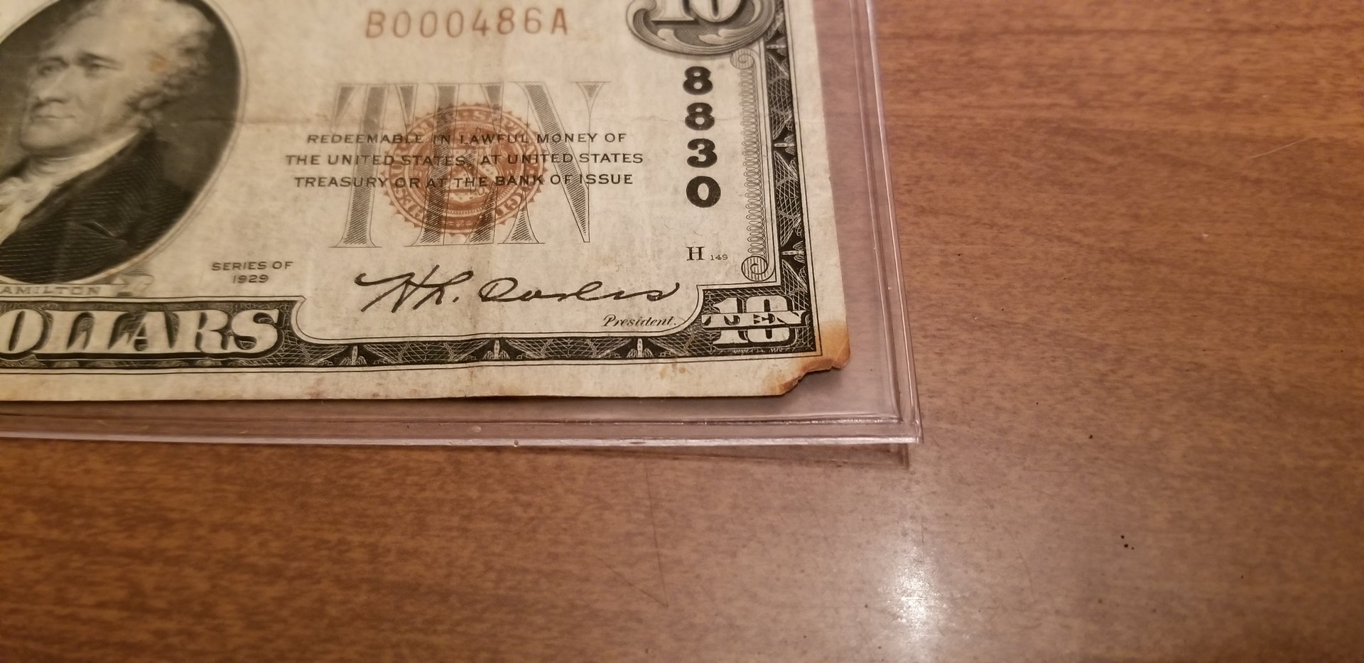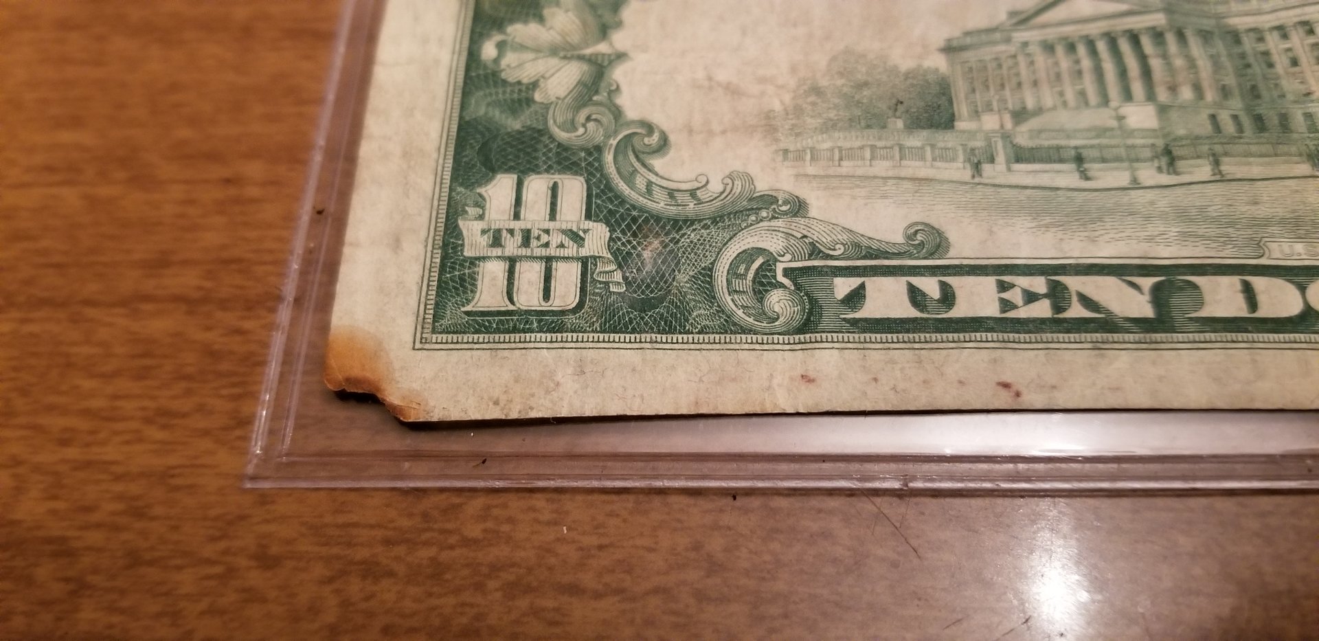 I got this national bank note, and it has this strange damage on it? At first glance it looks like burns, but I belive it may be chemical damage upon closer inspection? What do you belive is the cause? Also notice the light brown spotting around the note.