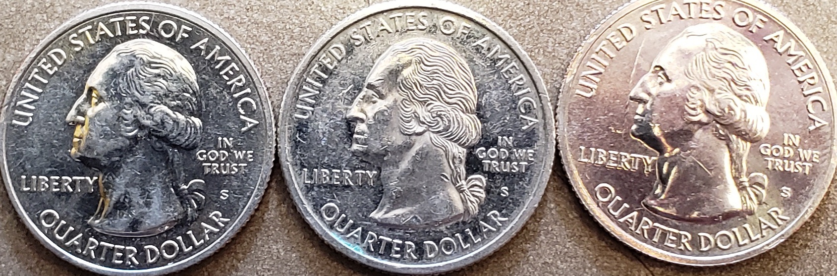 I agree the middle one looks like an impaired proof washington is very white and frosty.