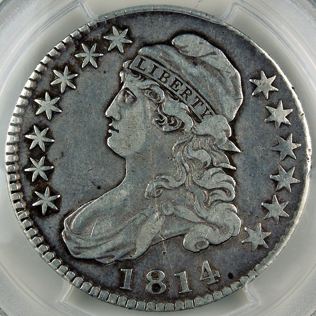 I recognize that TPG's are inconsistent in what coins they grade and which coins they determine to be "details" coins, but I'm curious on everyone's thoughts about the matter. Are there any standards for TPG's, written or unwritten, about what is acceptable as far as problems go? Should there be? Most people agree that coins in VF or lower are allowed certain scratches that XF-AU's are not, but sometimes what is allowed is questionable. So please share your opinions about what is acceptable and what probably shouldn't be. Better yet, post some examples! Here's my 1814 E/A that resides in a problem-free PCGS VF25 holder. The obverse boasts a long scratch running north to south. The reverse shows the development of some sort of verdigris or environmental damage/issue. Yet it graded VF25... Here is a PCGS AU55 capped bust half that has a couple light staple scratches on the obverse and some patches of black gunk on the reverse. It also is toned in the form of fingers holding the coin at 7 to 8 o'clock on the obverse and 1 to 3 o'clock on the reverse, making me wonder if it was dipped out at some point. But perhaps the cleaning was acceptable...