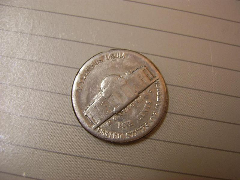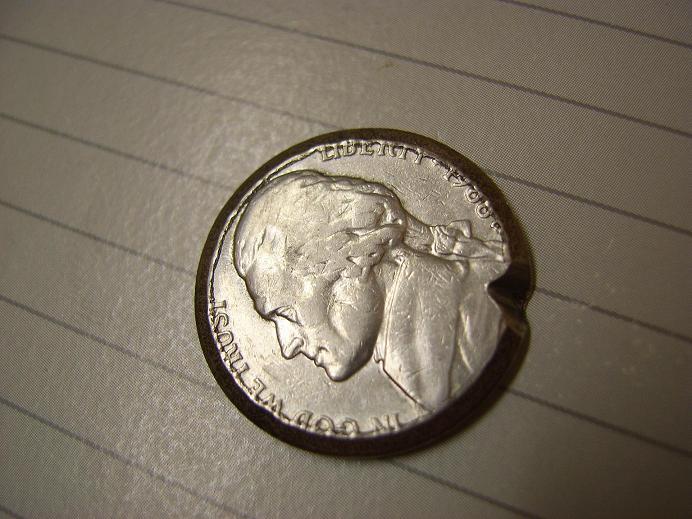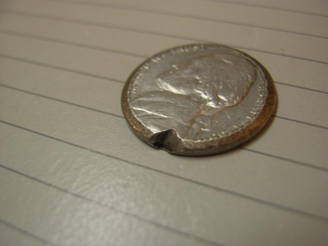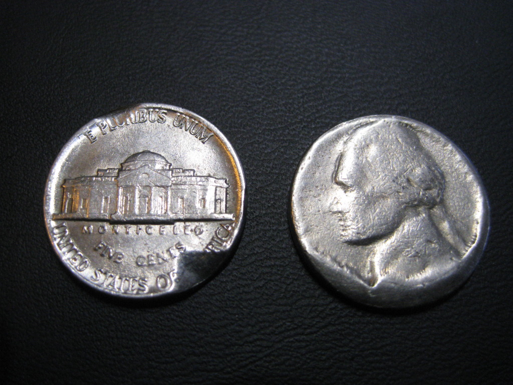 Here are the coins in question: I assume both are post mint damage but just curious if anyone had ideas what could have caused either. For the Nickel on the left there's some damage on the obverse but I didn't include the pic. Looks like chunks have been carved out of the reverse. Coin in hand however you can kinda see the affected letters kinda smeared like the metal was pulled or something.