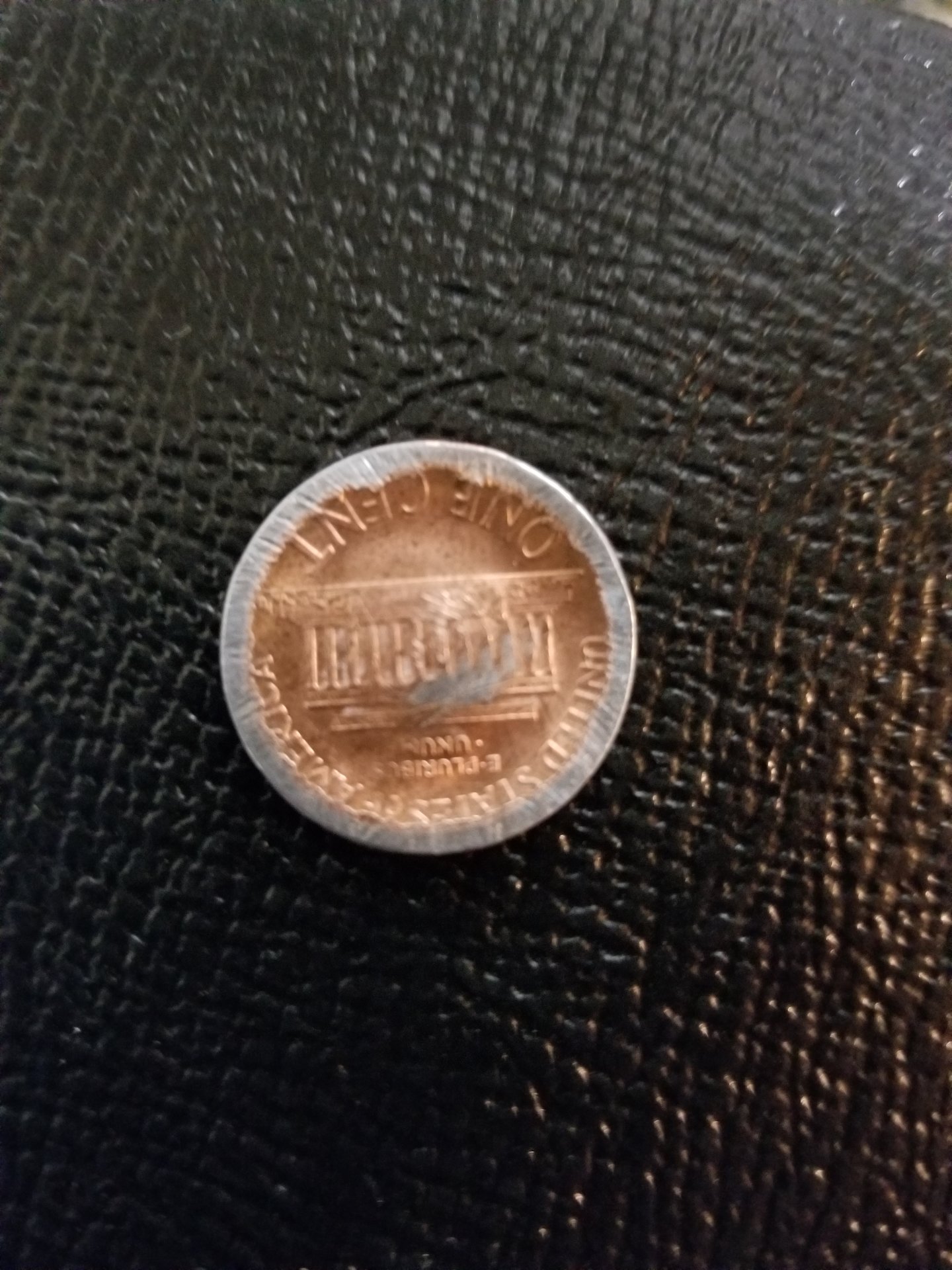 Found this penny today. First thought was that it had been run over but the appearance and feel of it leads me to believe that's not the case. The edge is silver and has sort of a bowl going on on the reverse side of the coin. The front although scratched is perfectly flat. Also the edge is split with silver color on one side and copper penny color on the other. Any ideas?