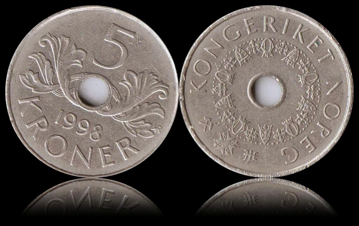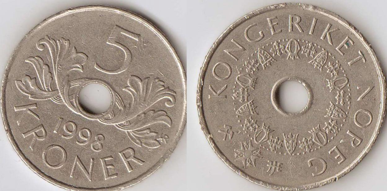 As I was walking to the train station after work today, I looked down at the corner of Wabash and Lake streets in Chicago and saw this lying on the sidewalk. It's a Norway 5 kroner coin from 1998. I know it's nothing special and it has some damage but it was so weird to find it there that I just wanted to share it.