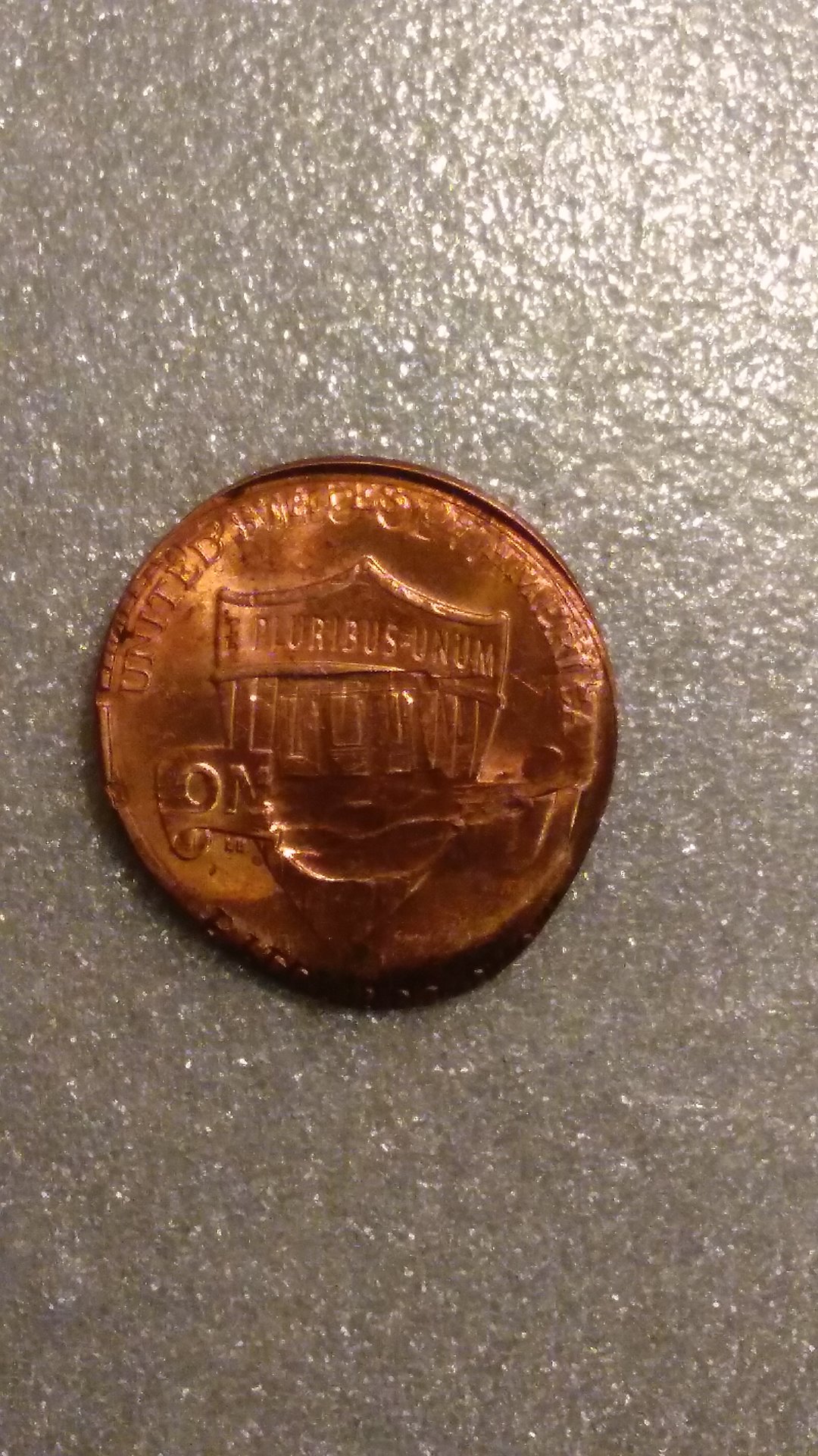 From the larger picture of the reverse it looks like a "vice job" squeezed between a flat surface and the rev of a five cent piece. The shield shows a vague outline of the top of Monticello, and below the shiled along the edge you can see the reversed incused inscription E PLURIBUS UNUM.
