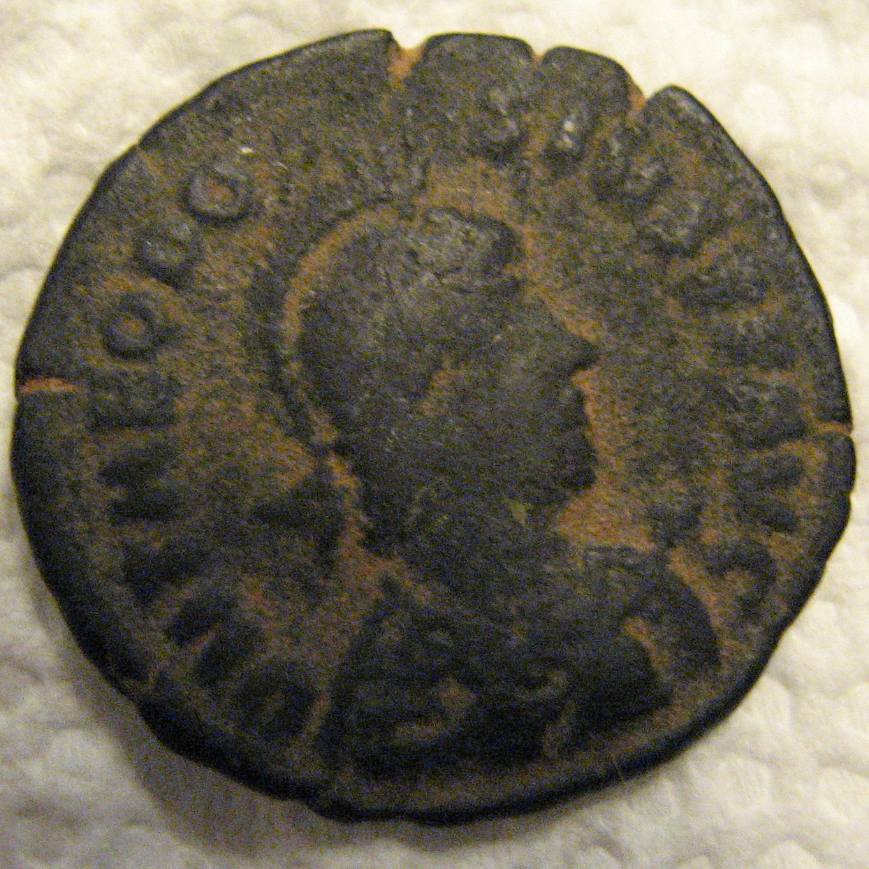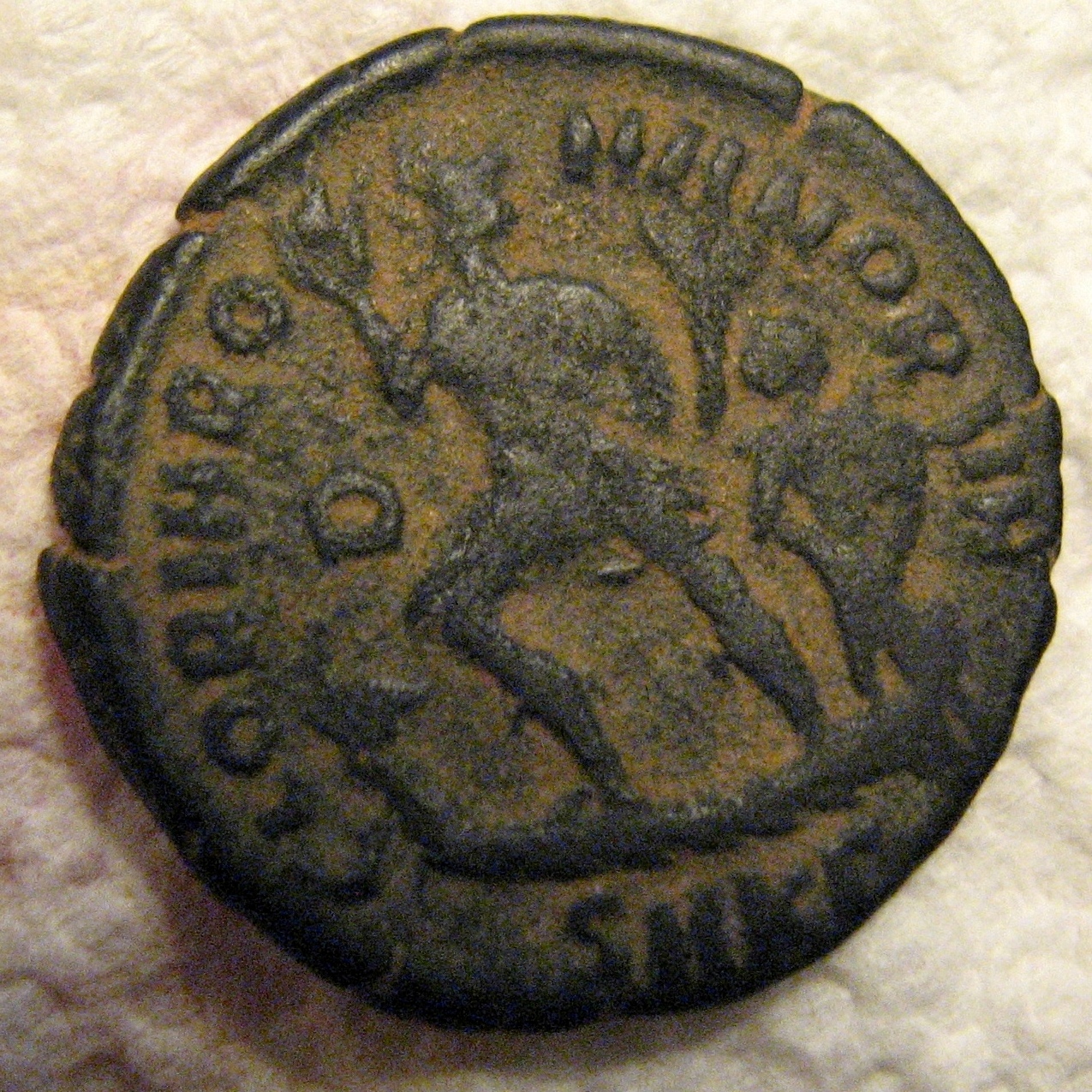 Thanks guys... Same size as a US quarter. I found this: http://www.ebay.com/itm/SBC-Theodosius-I-AE-25-Maiorina-GLORIA-ROMANORVM-RIC-IX-Cyzicus-14c-/321623167491?pt=Münzen_Medaillen&hash=item4ae23c1203 It looks like the same maybe ?