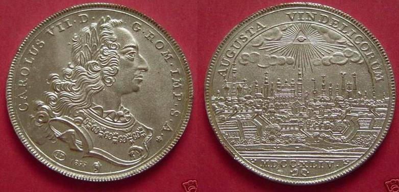 Seems like a 1977 restrike of something... but I don't know if this was made by a mint or private medal company: The obverse reads "Carolus VII * D * G * ROM * IMP * S. A. *" with three notes in ovals at the neck: 1977 / IT / 1835. The reverse reads Augusta VinDelicorum * MDCCXLIV* and two horse shoes (one tilted with the bottom out to the lower left, one tilted out to the lower right).