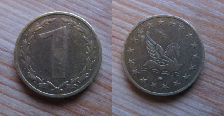 No writing, no clues - just an image of pegasus in water, kinda rock (or just a defect) surrounded by 18 stars. It's a currency, though, since number one.