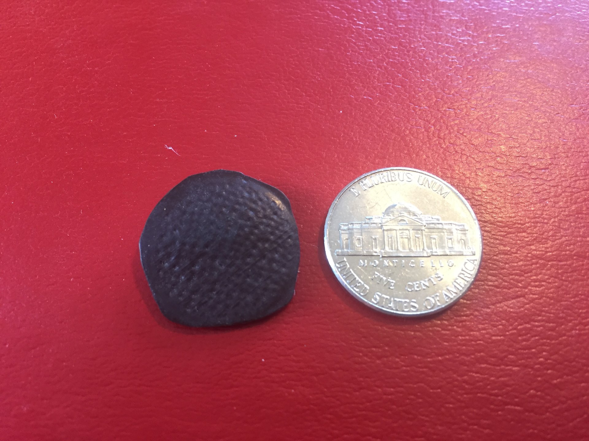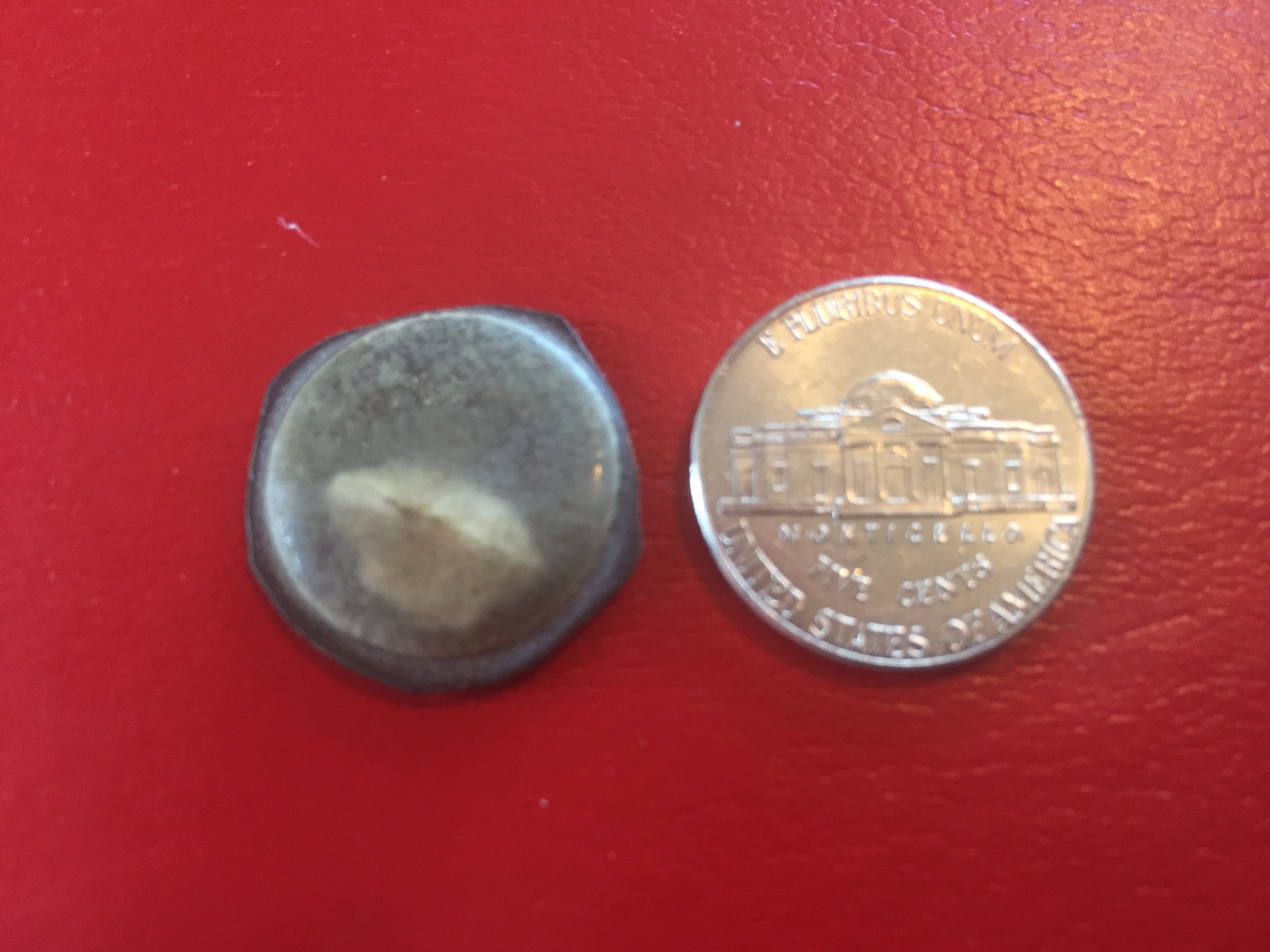 Pearl buttons or decorative pins for clothes were commonly made a sliver of pearl , with black or reflective silver type metal backing and a quartz cover for protection. If they separate many pearl layers desiccate and crack and powder out, leaving the backing and the quartz cover. Guess with details and photo given.