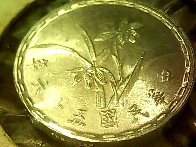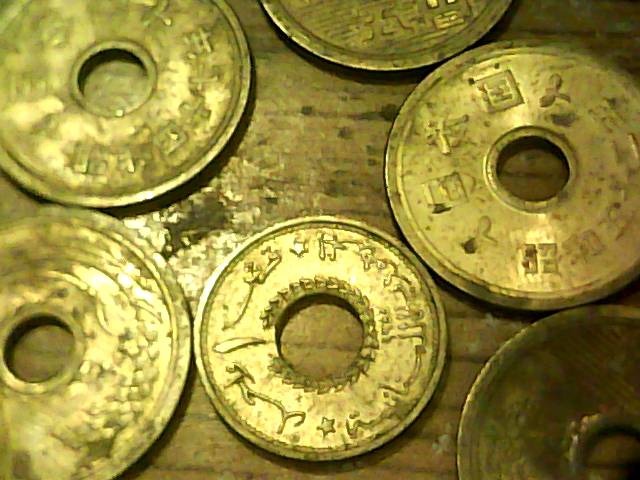 All of these are Japanese 5 Yen coins except the one coin in the center. 1 Yen = about US 1 cent. This is also a great World Coin site: http://en.numista.com/