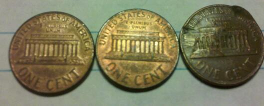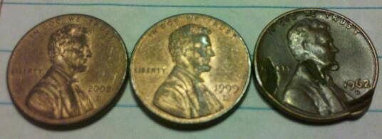 I'm just gettingyalls thoughts on what if anything is wrong with these pennys. The two on the left look at if there missing a good ammount of plateing as its worn off in the high points and the feilds feel like sand paper. The one on the right might have been doen with a tool how ever I have never seen a tool that could do that to a penny.