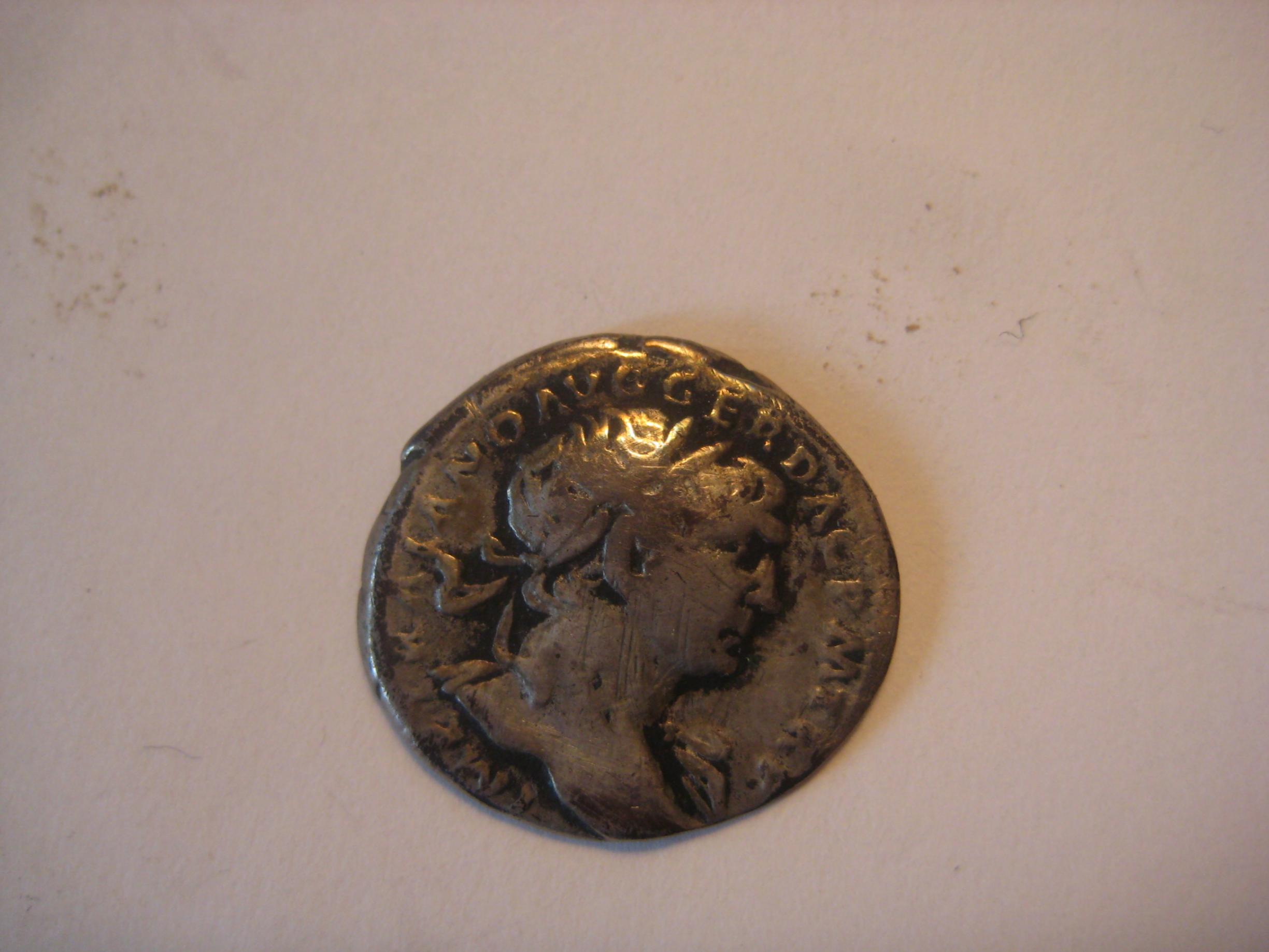 The first is a denarius of Trajan (reigned AD 98-117): Obverse: IMP TRAIANO AVG GER DAC P M TR P, laureate head r., drapery on l. shoulder Reverse: COS V P P S P Q R OPTIMO PRINC, Roma standing l., holding Victory and spear RIC 115 The latter coin is an antoninianus (worth 2 denarii, but by this point, successive debasement had removed almost all of the silver content) of Victorinus or maybe Tetricus I (I'm having trouble reading the obverse legend to confirm), and it's from the Gallic Empire in the mid third century AD. The reverse reads "SALVS AVG," and depicts the goddess Salus standing right, holding patera, feeding serpent in arms.
