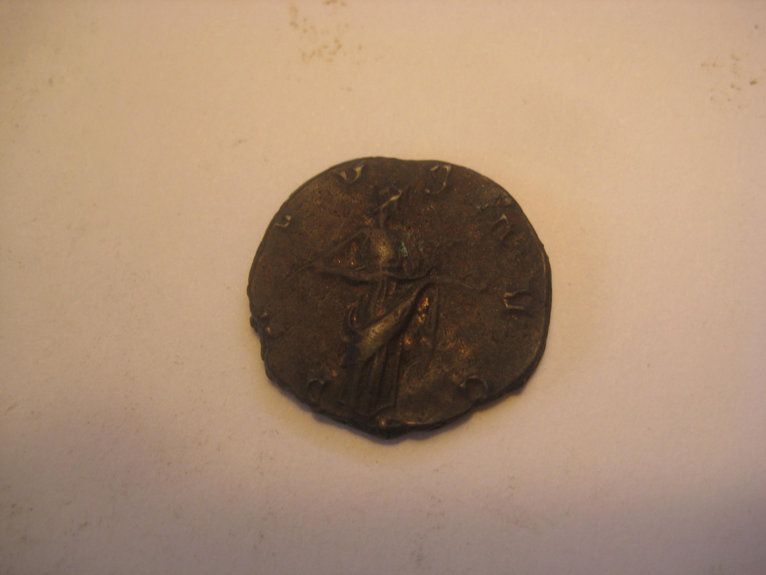 The first is a denarius of Trajan (reigned AD 98-117): Obverse: IMP TRAIANO AVG GER DAC P M TR P, laureate head r., drapery on l. shoulder Reverse: COS V P P S P Q R OPTIMO PRINC, Roma standing l., holding Victory and spear RIC 115 The latter coin is an antoninianus (worth 2 denarii, but by this point, successive debasement had removed almost all of the silver content) of Victorinus or maybe Tetricus I (I'm having trouble reading the obverse legend to confirm), and it's from the Gallic Empire in the mid third century AD. The reverse reads "SALVS AVG," and depicts the goddess Salus standing right, holding patera, feeding serpent in arms.