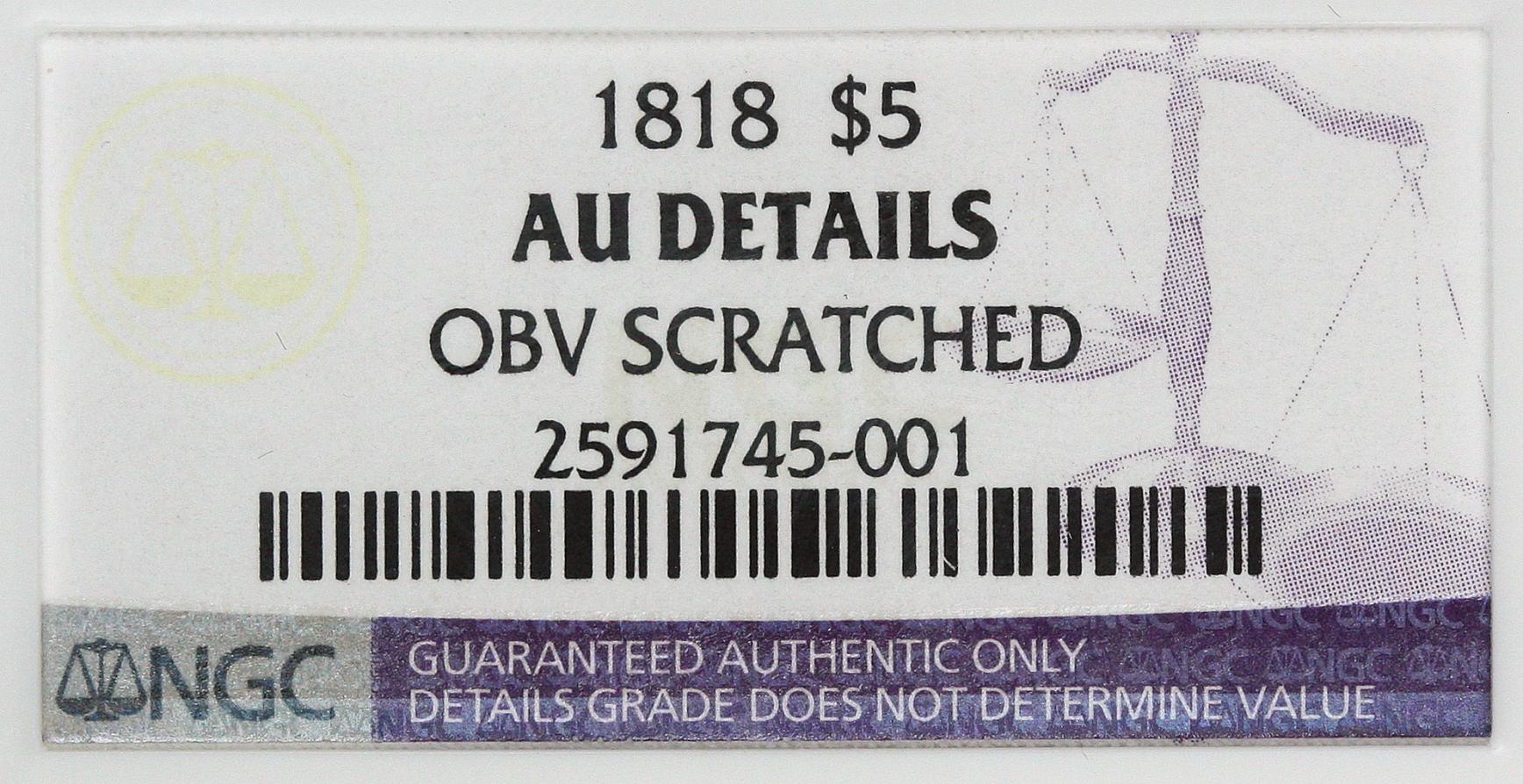 Here is an update... I thought they were a little harsh on the 1818 $5... the coin has a vertical scuff on the cheek and can only easily be seen with a low angle light... but alas still a great coin and one I'm happy to own and offer to my clients.