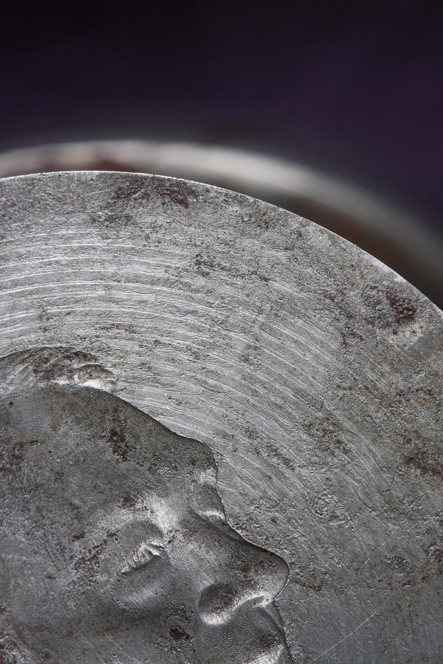There are two possible sources for lathe lines. They could be created when the lathe is used to make the shallow cone on the die blank, or they could be left on the master hub from the reducing lathe. Since the lines are on the field they can be polished off the fields of a die. But polishing them off the fields of a hub, and removing them all the way to the edge of the devices, without polishing details off the hub would be very difficult. Lathe lines from the master hub could be polished off the master die and not progress to the working hubs and working dies. The chances that the lines would survive the polishing of both the Master die and the working die would be slight. Lines left from the machining of the die blank is much more likely.