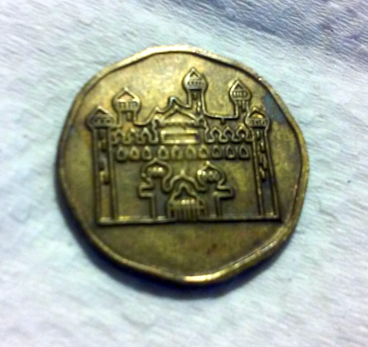 Yep Aladdin's Castle, we used to have one or two in Louisville back in the early 80's. You picture of the obverse is upside down. If you turn it over the odd figure is Aladdin, a man with a beard wearing a turbin. A lot of people can't see it until they are told what it is.