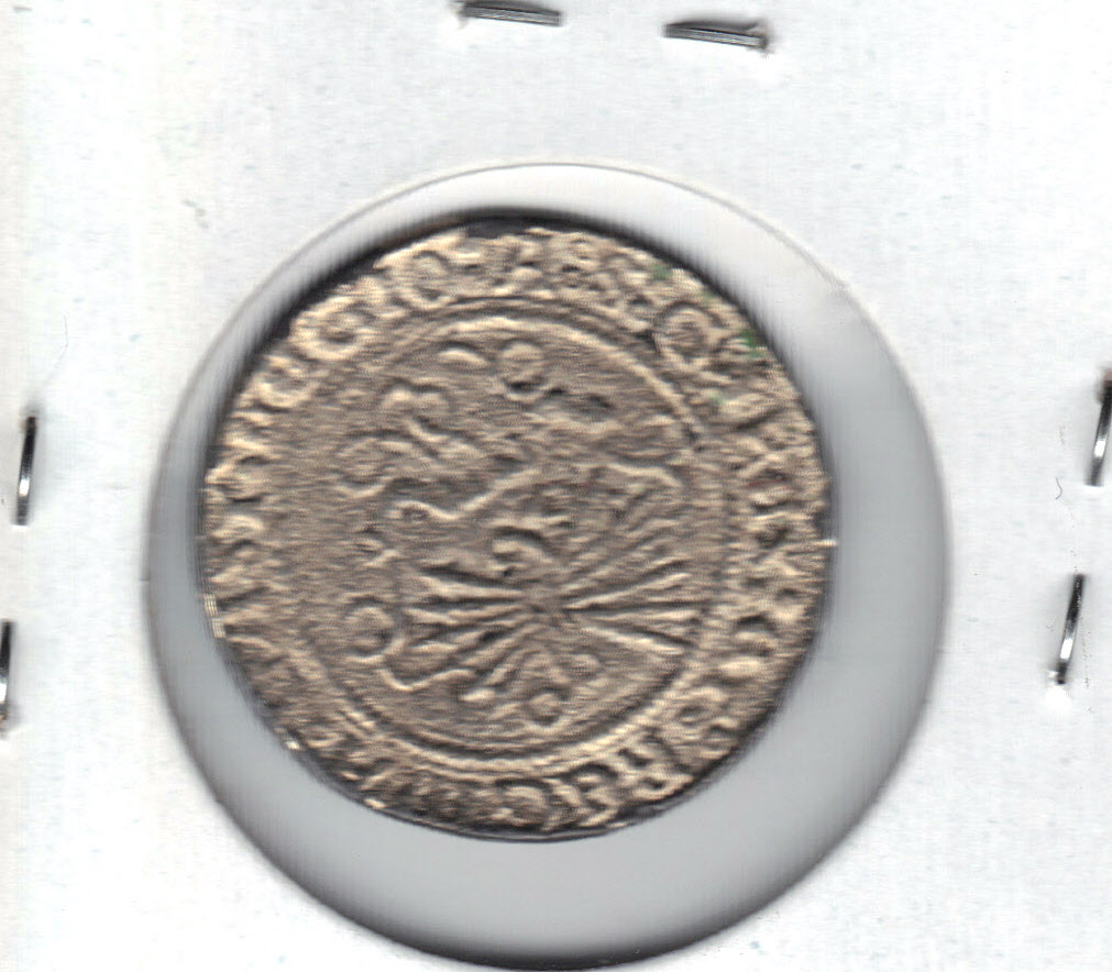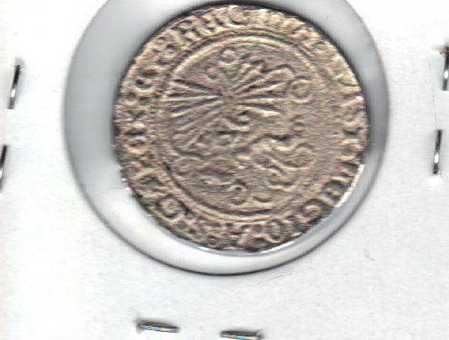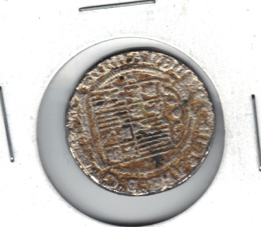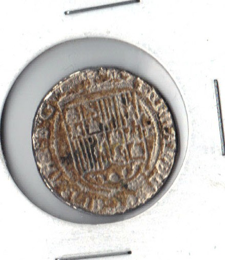 Looks like a coin of Ferdinand and Isabella, yes the two who financed Columbus. But the surfaces of this coin make me think its fake. Spain Castile and Leon Ferdinand and Isabella 1474-1504 AR Real Obv: Crowned Coat of Arms Rev: Bundle of arrows with ribbon and yoke