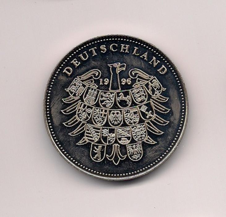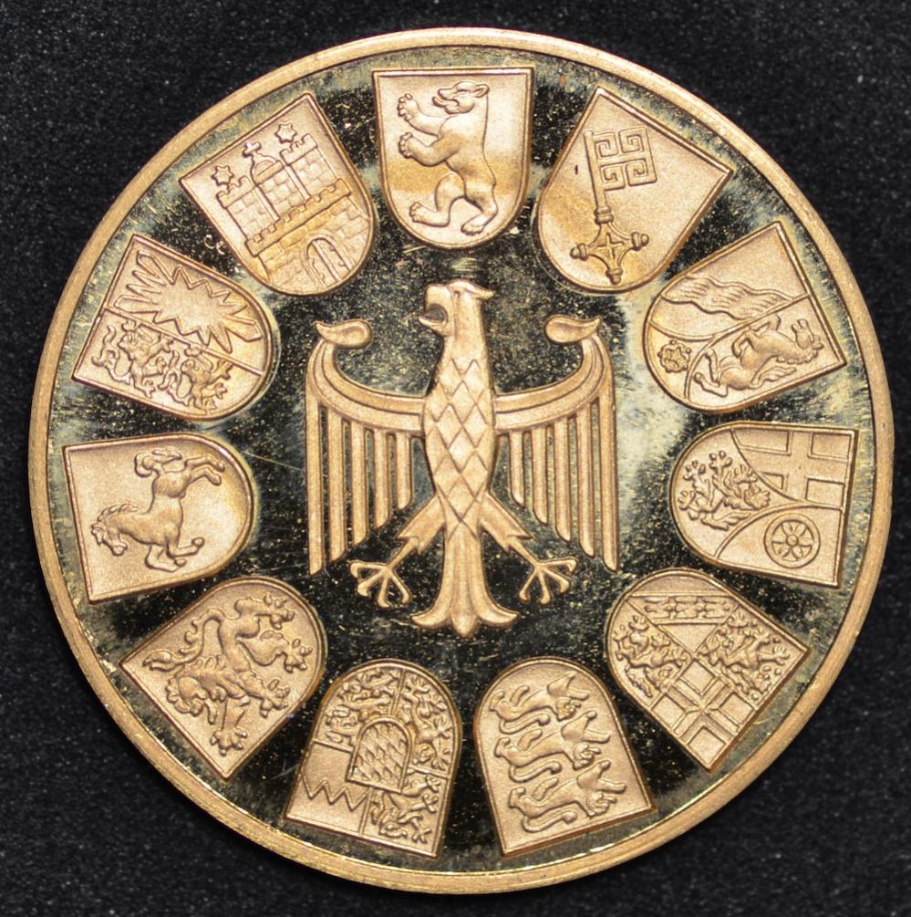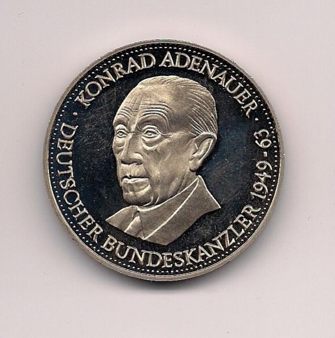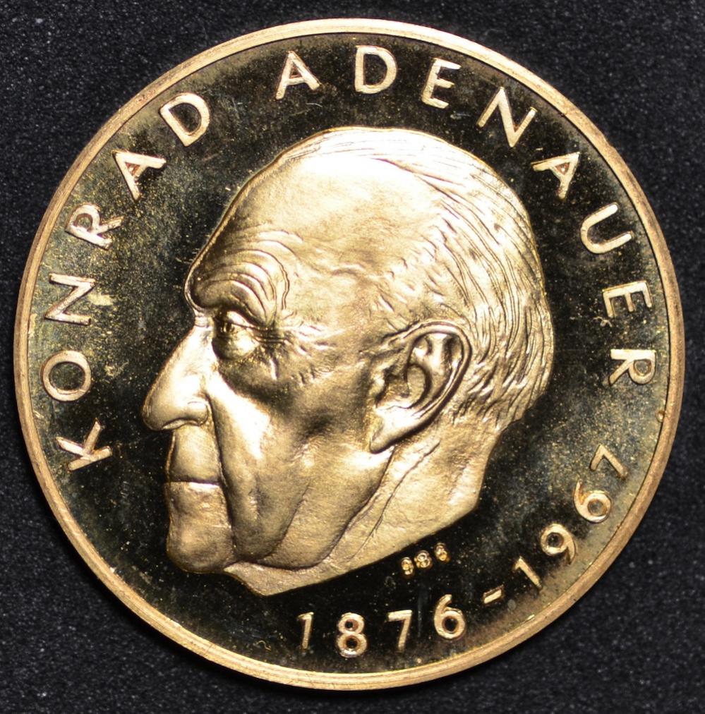 Looking up a coin for a friend: Gold proof coin/medallion/medal Weight: 9.9 grams Diameter: Text: Konrad Adenauer 1876-1967 Medal alignment Slightly larger than a US Quarter (so, about 25 mm?) Non-magnetic I was guessing it was Austrian in origin, but can't find it in the Krause catalogs. Also tried Germany... Here are the photos: