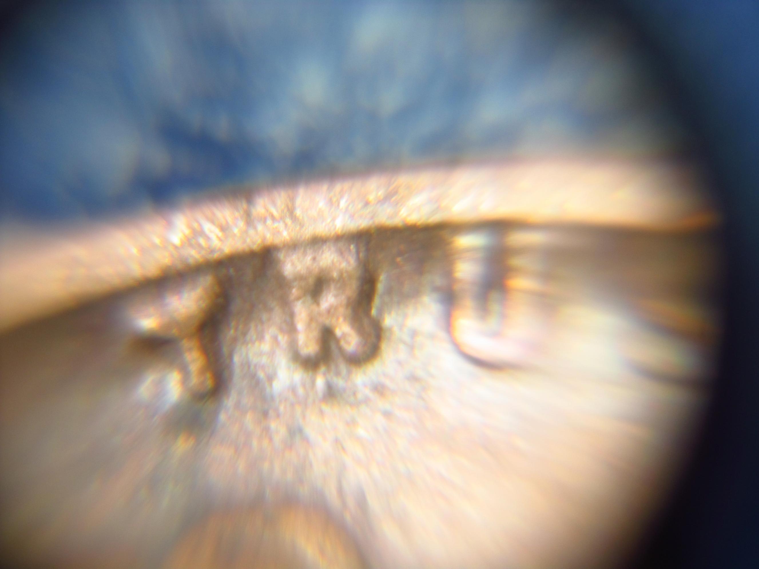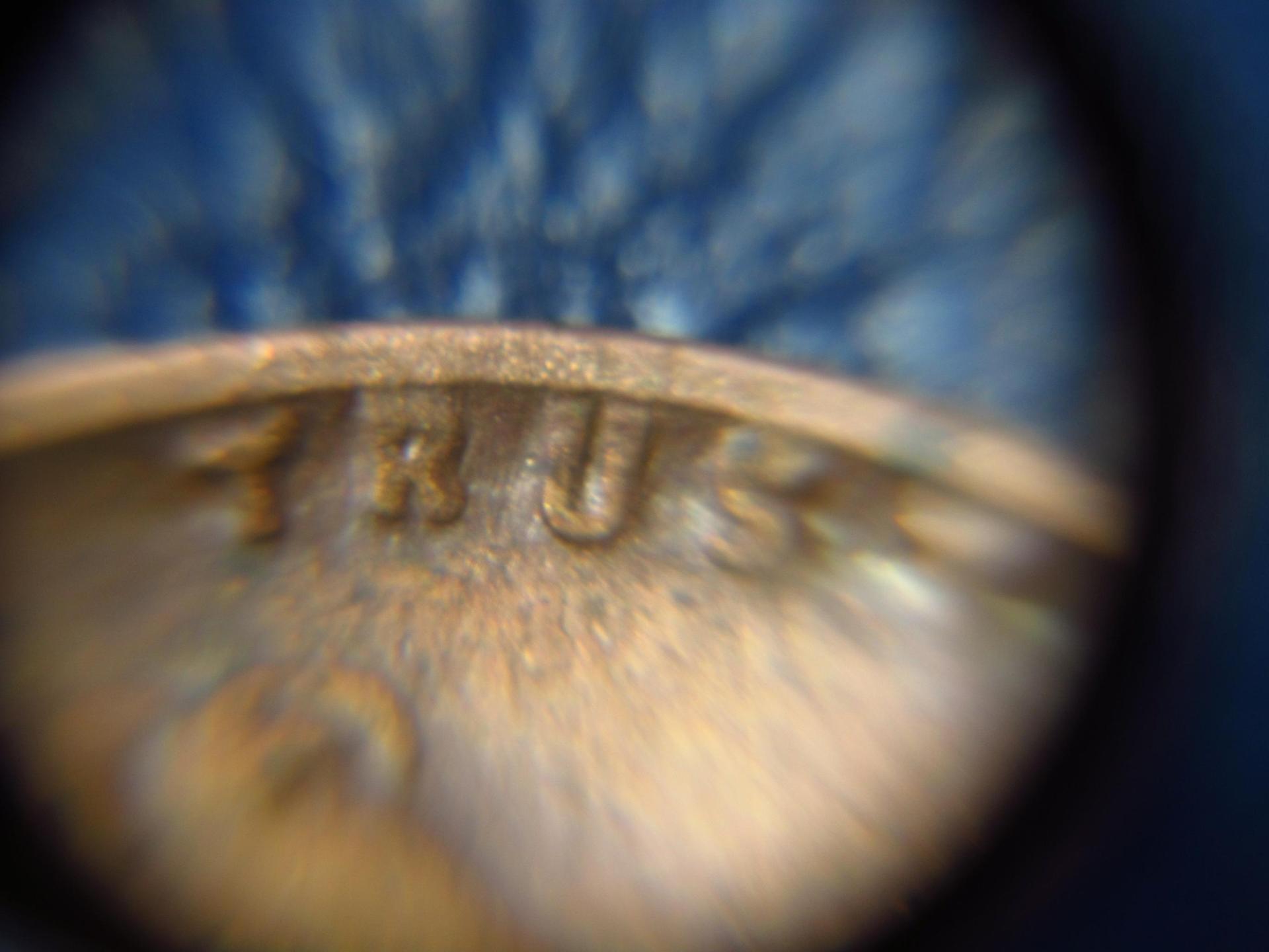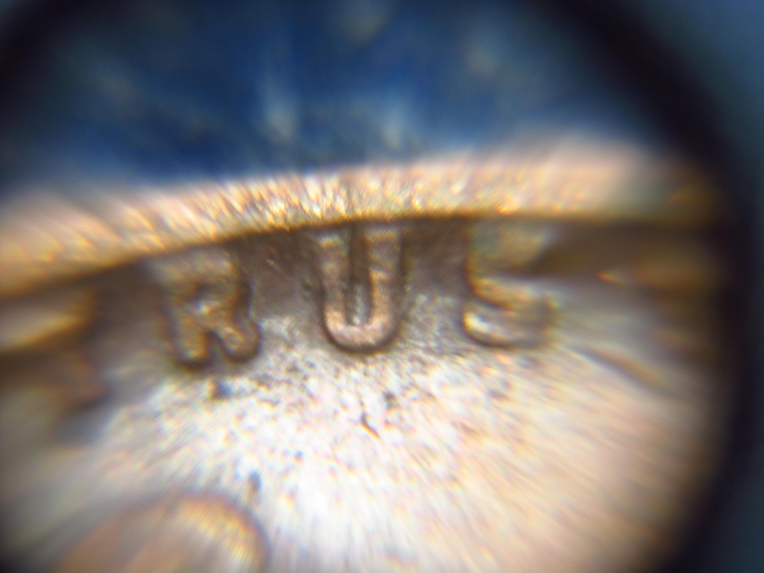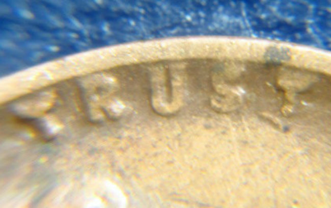 M/D or S/D? all 5 letters in 'trust' are doubled to the north and to the east with the tops of all the letters being twice as wide as the lower half. the tops of both Ts go up almost into the rim. '25 d.