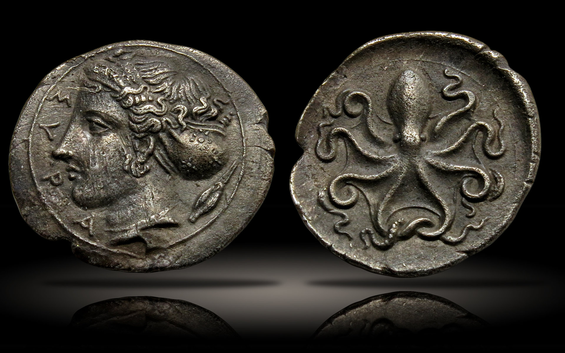 Rev: crab, between its scissors A; below fish (polyprion) to the right.