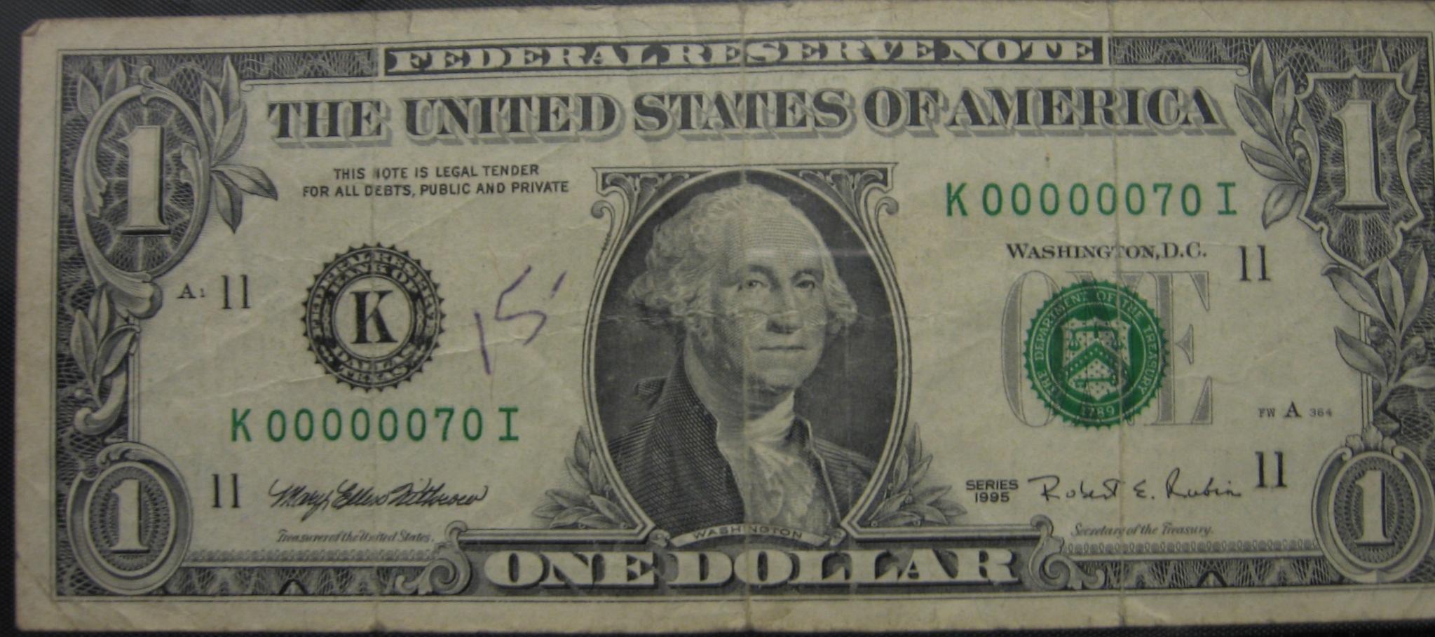 Don't ya just love how some expletive :dead-horse: wrote "15-" on your low series bill.[/QUOTE] Oh man, I guess it;s still better than the "Wheres George" stamp on it. I am shocked at some of these low serial numbers from circulation. That gives me hope that I can find a 3 or 2 digit.