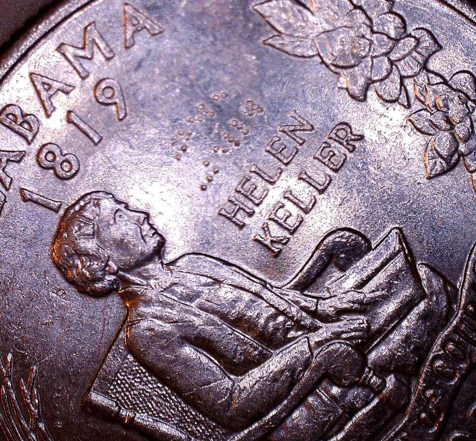 After looking at the close up it would be her ring finger, I do not see anything like that when I googled the coin.