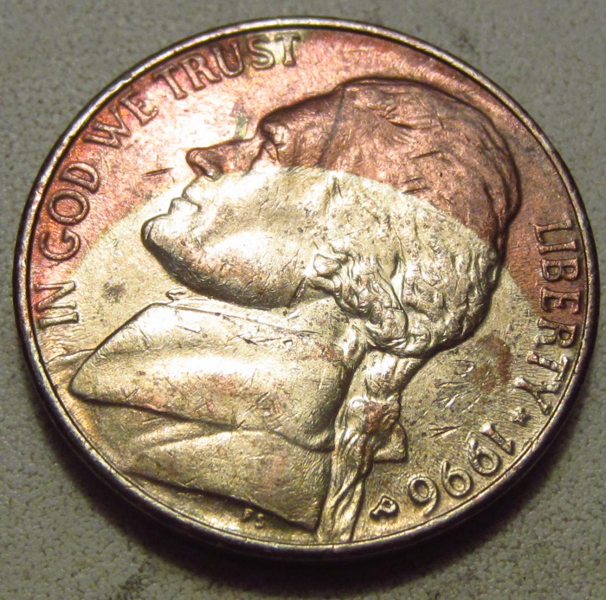 it toned while stacked with other nickels, like when someone spilled soda on it. the coins above and below it protected part of the coin.