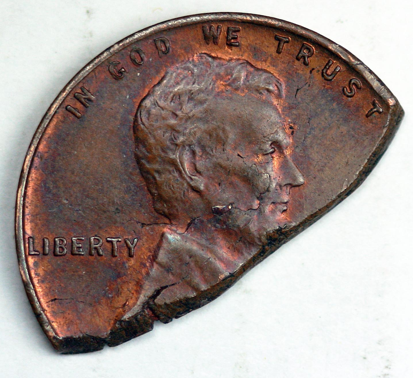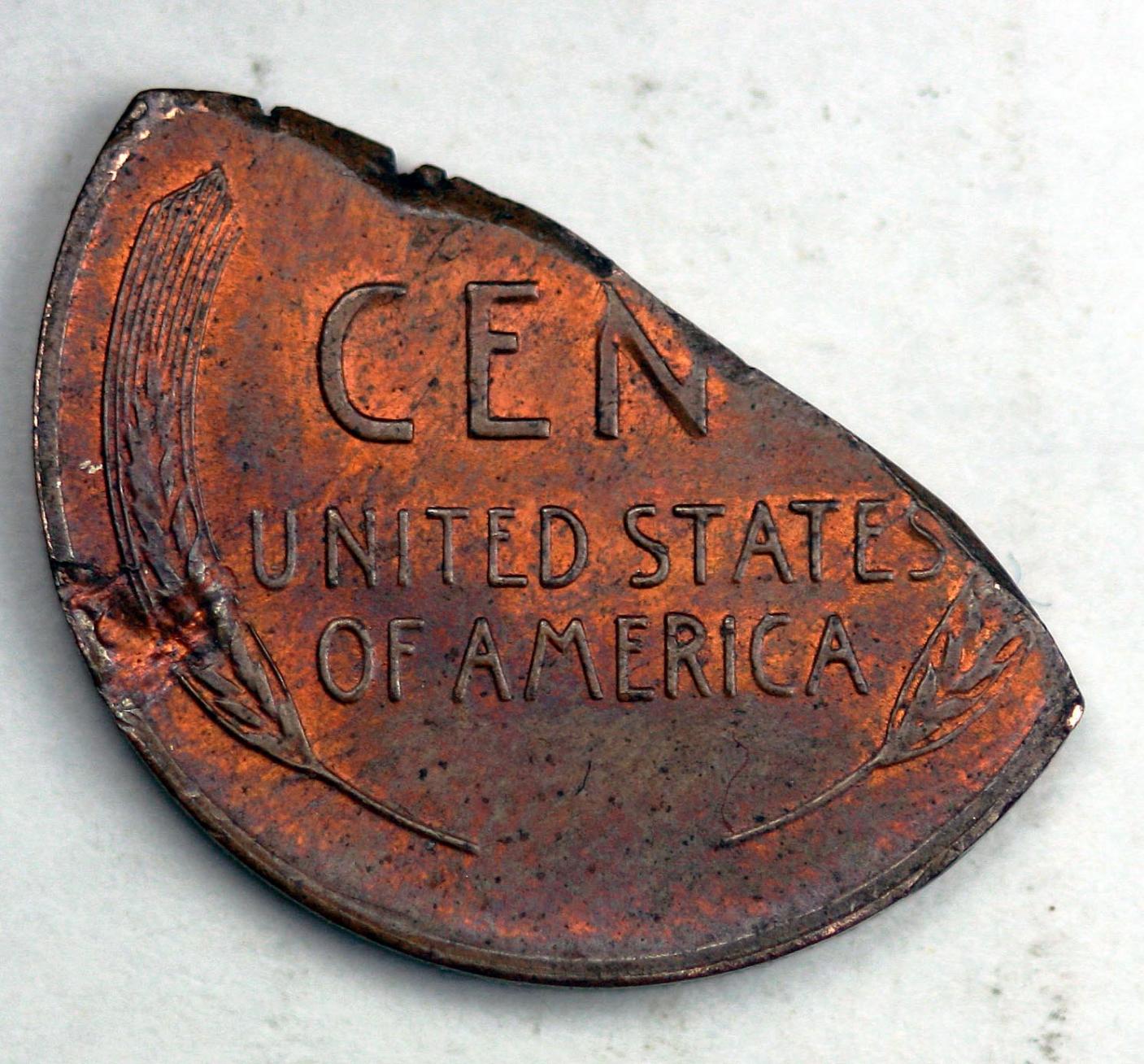 That is an interesting find. I don't think it's PMD, only because there is no bending, tool markings, it's still got a little red in there. It's like it cracked, defective planchet is an honest guess. Would be cool if you still had the other piece of it.