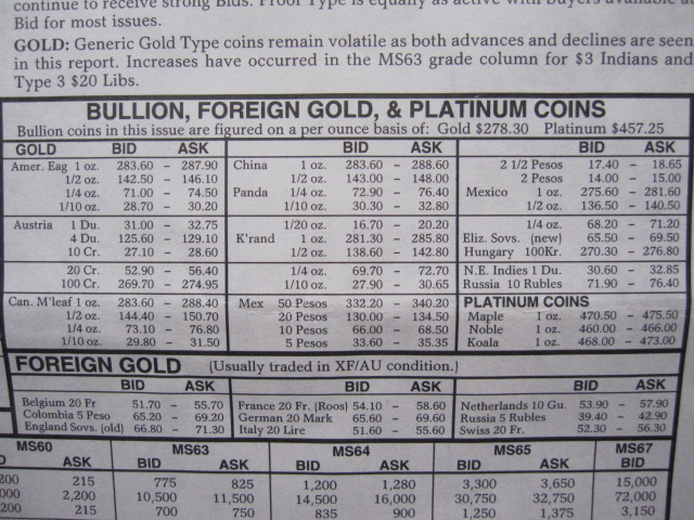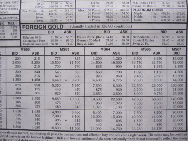 Jan 1980 CDN $10 Ind XF/AU bid $450 ask $500 MS-60 $900/$975 MS-65 $5300/$5850 $20 St G XF/AU bid $670 ask $700 MS-60 $785/$810 MS-65 $1300/$1450 Dec 1969 CDN (Earliest I have with type gold prices.) $10 Lib XF $38/$40 Unc $43/45 $10 Ind XF $63/$66 Unc $70/$72.50 $20 Lib XF $61/$62.50 Unc $62/$63.50 $20 SG XF $60.50/$62 Unc $61.50/$63