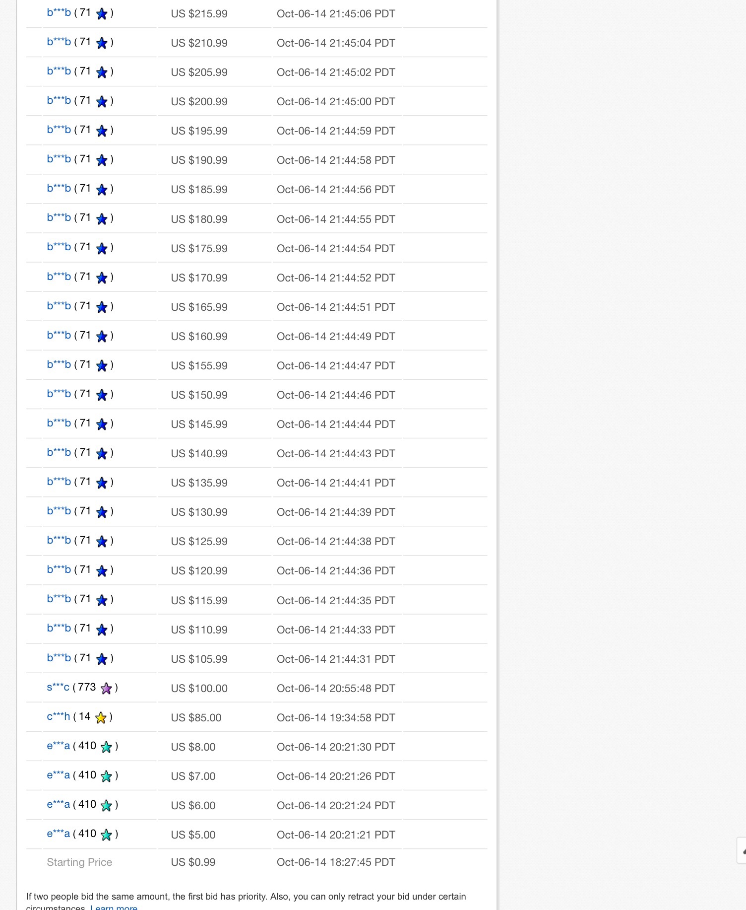 I’m sure all of the above reasons are possible, but, let’s not forget some people have disorders that force them to bid. Sometimes they bid too much and over pay. Sometimes they satisfy the erg by bidding low, thus never suffering the repercussions of spending more money than they have. This must be the dynamic at work when I place an auction for an item with a BIN of $500 and an opening bid of $0.99 with a reserve and receive more than 10 bids, all under $100. If they’re sane, which may not be the case, they know they’re not going to win, yet they get something out of bidding.