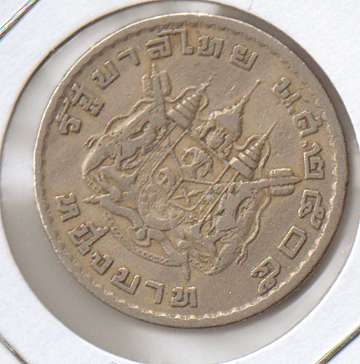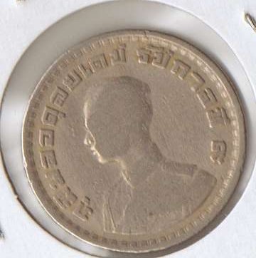 Seems like Thai Baht from 1962. The worn fellow in glasses in the back is a very recognizable sign of Thai coins (Bhumipol Adulyadej Rama IX).