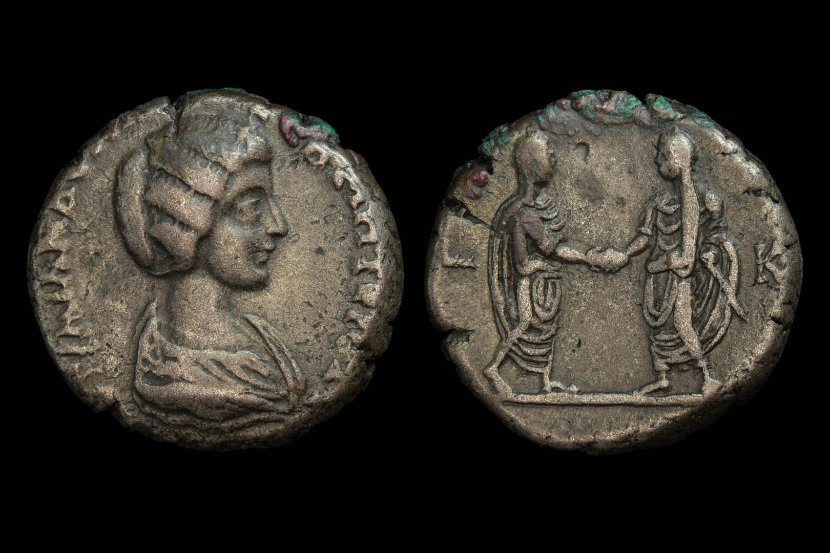 My favorite coin obtained in this millennium is year 20 LK September - December 211, the year Septimius died. LK could also be January to August 212 but the reverse here shows Caracalla and Geta shaking hands and would not have been likely continued after the mint got word that Geta was murdered. I believe this is the only coin type struck after Septimius died showing the boys together which is why I like the coin so much but the portrait is also interesting. There is an obverse die match using a year 18 reverse. (Double striking makes this ID less than 100% but I believe it is a match). There are other LK reverses using the Domna portrait style I lack that is very much like the Rome mint portraits following Septimius' death. I suspect that the order to change portraits came with the word of Geta's death.