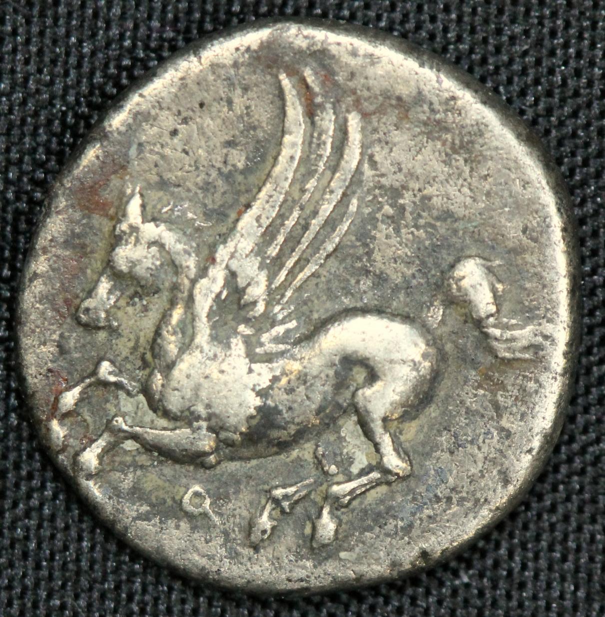 A very similar coin is on vcoins identified as: [h=2]CORINTH GREECE SILVER DRACHM LATE 4TH CENT BC PEGASOS TONED GOOD FINE[/h]Corinth, Corinthia, Greece, Late 4th Century B.C. Silver drachm, BCD Korinth 156; BMC Corinth p. 18, 184; SNG Fitzwilliam 3455; SNG Cop 136, gF, chipped, scratches, 2.284g, 14.7mm, 180[SUP]o[/SUP], Corinth mint, Pegasos left, koppa below; reverse head of Aphrodite left, hair in a sakkos, wearing earring and necklace Older references identify the head as Nymph Peirene.