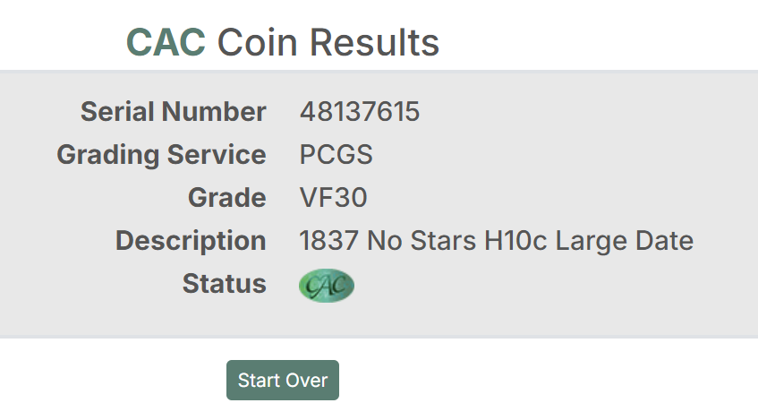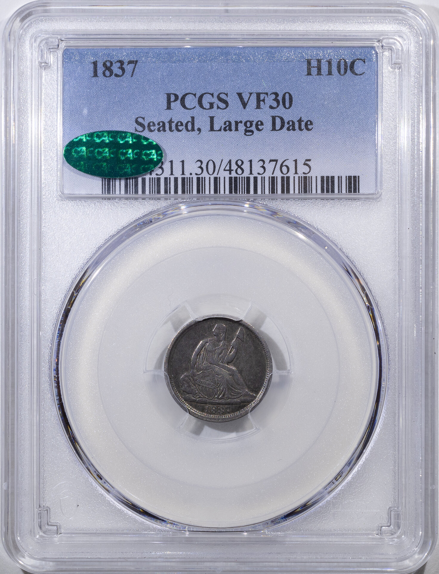 Will my 1837 H10C HALF DIME - SEATED LIBERTY, TYPE 1, NO STARS LARGE DATE PCGS VF30 get a sticker from CAC? I need the sticker for this to make it into my permanent collection, my so-called Box-of-100 CAC Type Set that I have been working on for a DECADE+. Vote now or forever hold your peace!