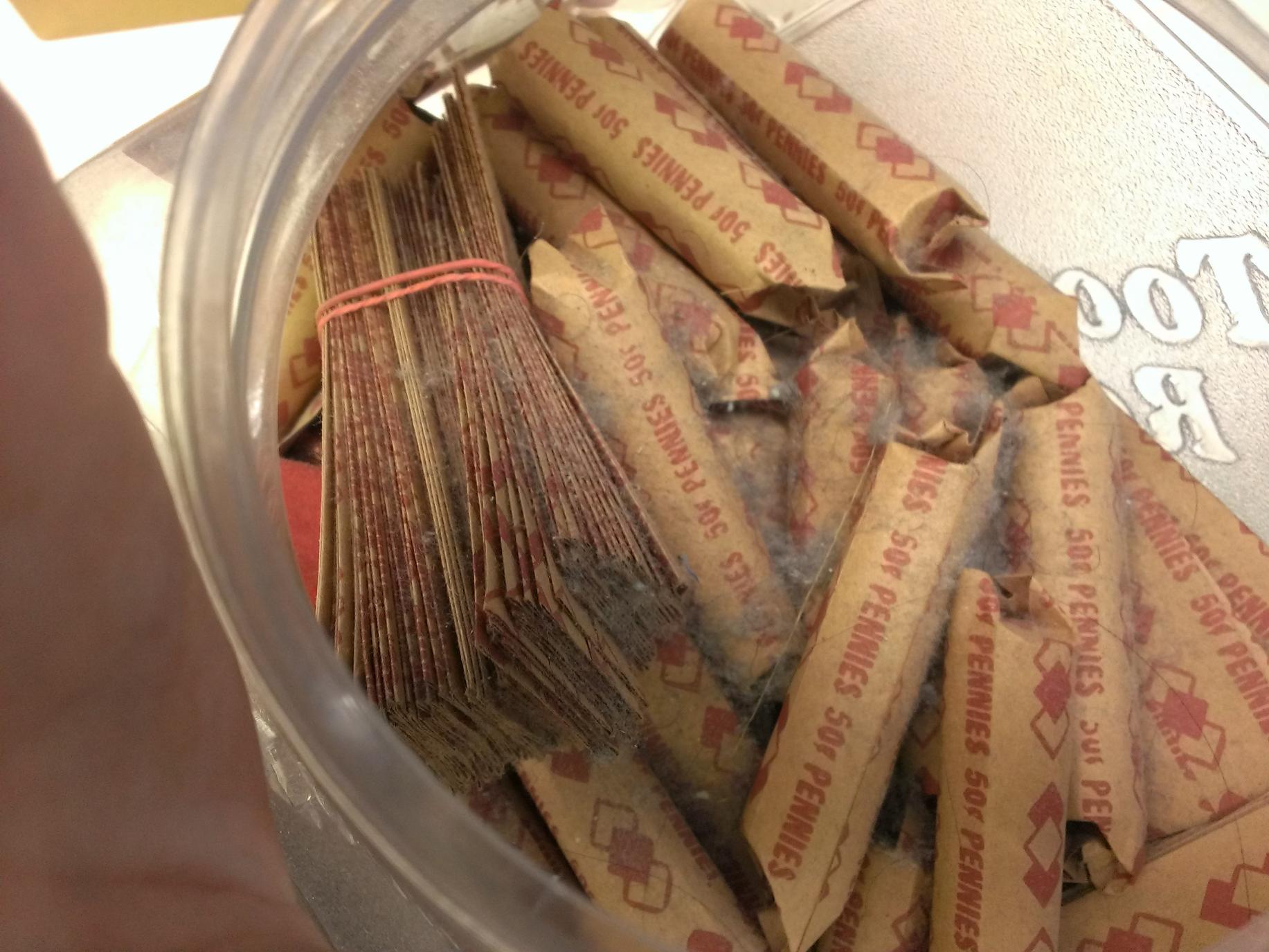 Here is the bucket with rolls in it. I was very happy to see all the dust. Im saving the rolls for last.