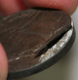 It's called a clamshell when it splits such that you can slide a piece of paper into the separation. It's not actually uncommon on the war nickels - the metal mix led to these and numerous other kinds of (more insignificant) laminations and such. Nice find, I think I paid $30 for mine (slabbed by ANACS). Like all errors on war nickels (and most other coins I guess), they are much more common on the P coins than D and then S.