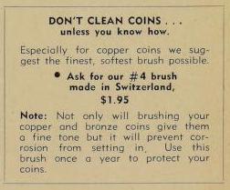 Don't clean your coins unless you use a very special brush. Ran across this ad in the Numismatic Gallery Monthly. Wonder if the Swiss still make the magic brush. Cal