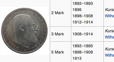 Christian, my "match" comment is a result of looking first at 19th Century Wurttemberg (in Krause), which had only too-small 2 Marks and too-big 5 Marks. When I went to the 20th Century book, and saw 3 Marks just before World War I, I was pretty sure that was the coin.