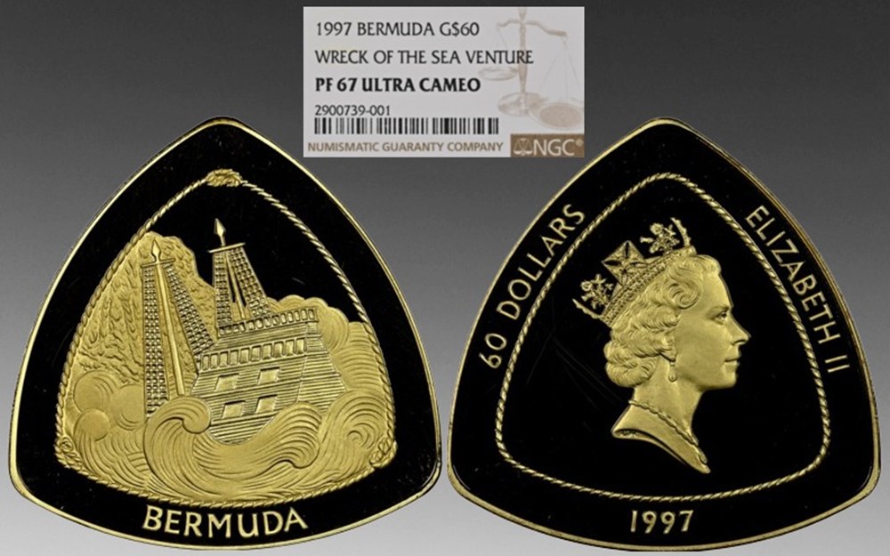 Also from Bermuda, a 1997 60-dollar “Bermuda triangle” containing slightly over an ounce of gold. Mintage: 1,500.