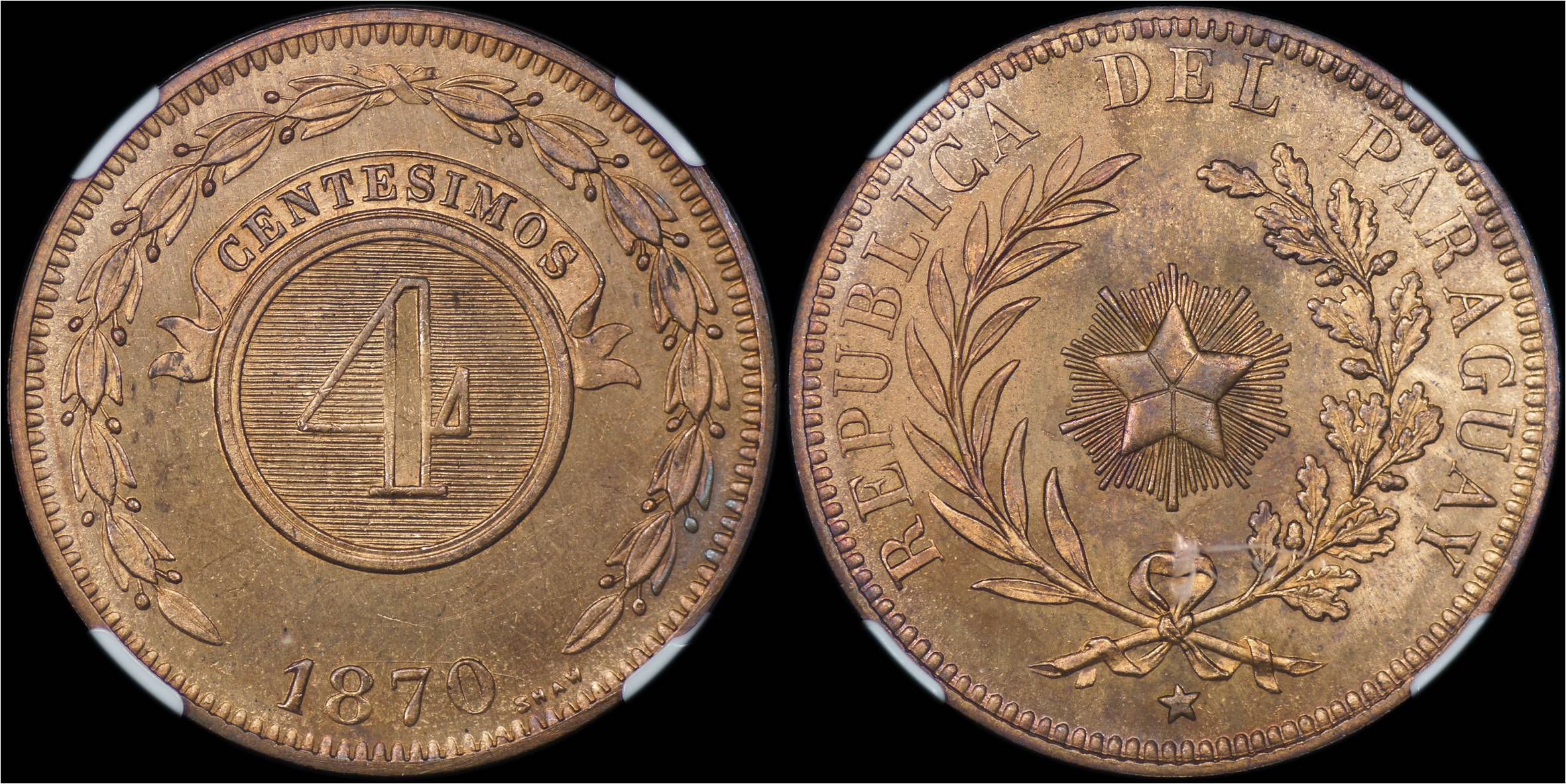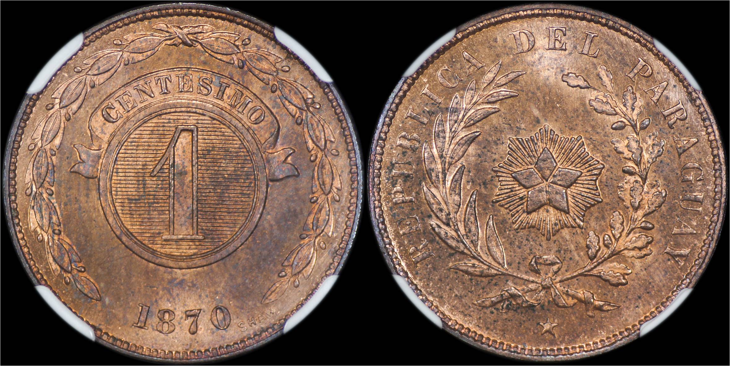 I started a new collection of Paraguay 19th century coinage. The gold coins (check out the history on those) would be very difficult to get, but the others make for a nice small set. Some beautiful coins indeed and not that expensive. These are the first three coins I got today and most likely the best documented specimens. KM 2 Paraguay 1870 1 Centesimo MS65 KM 3 Paraguay 1870 2 Centesimos MS64 KM 4.1 Paraguay 1870 4 Centesimos MS65