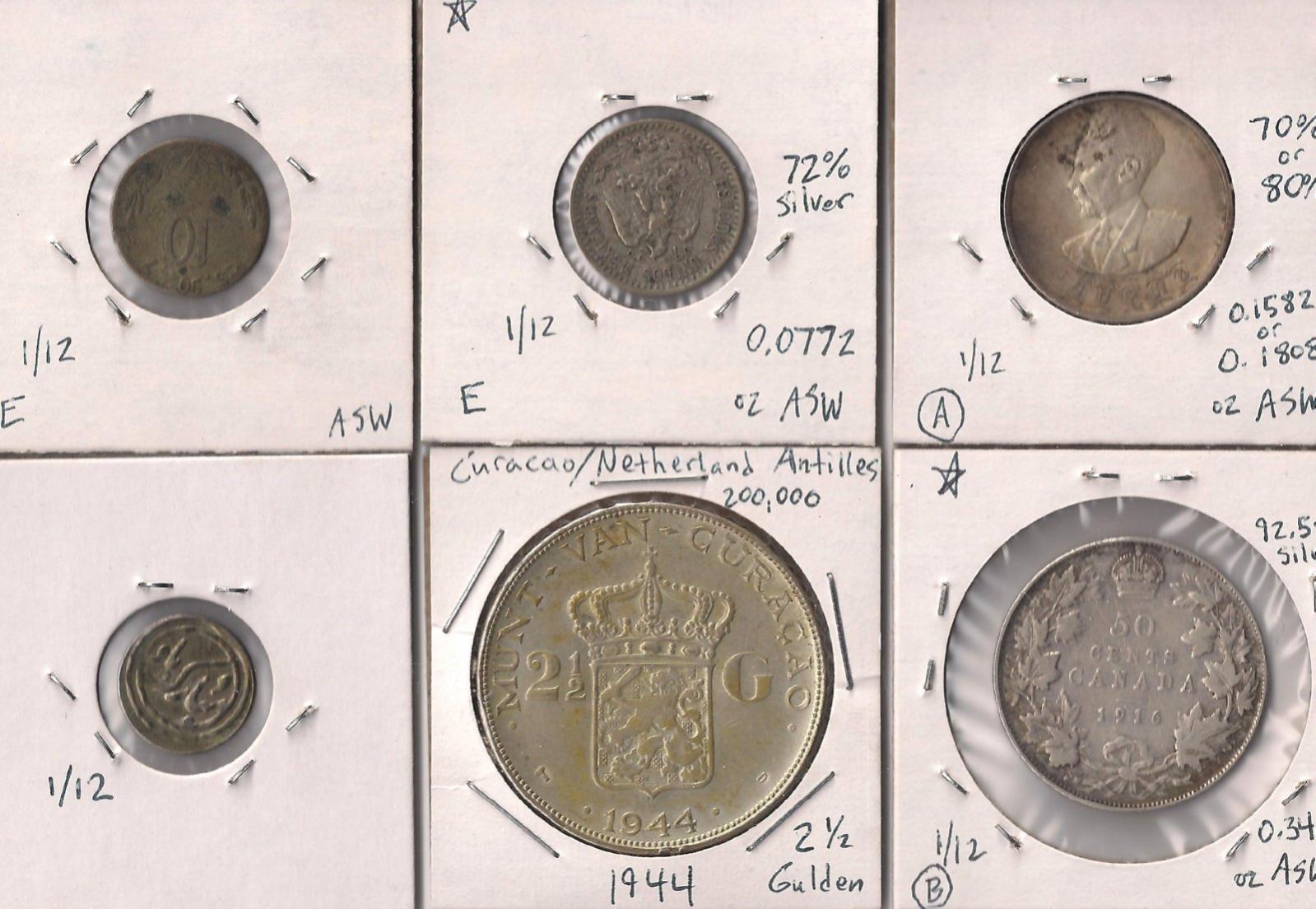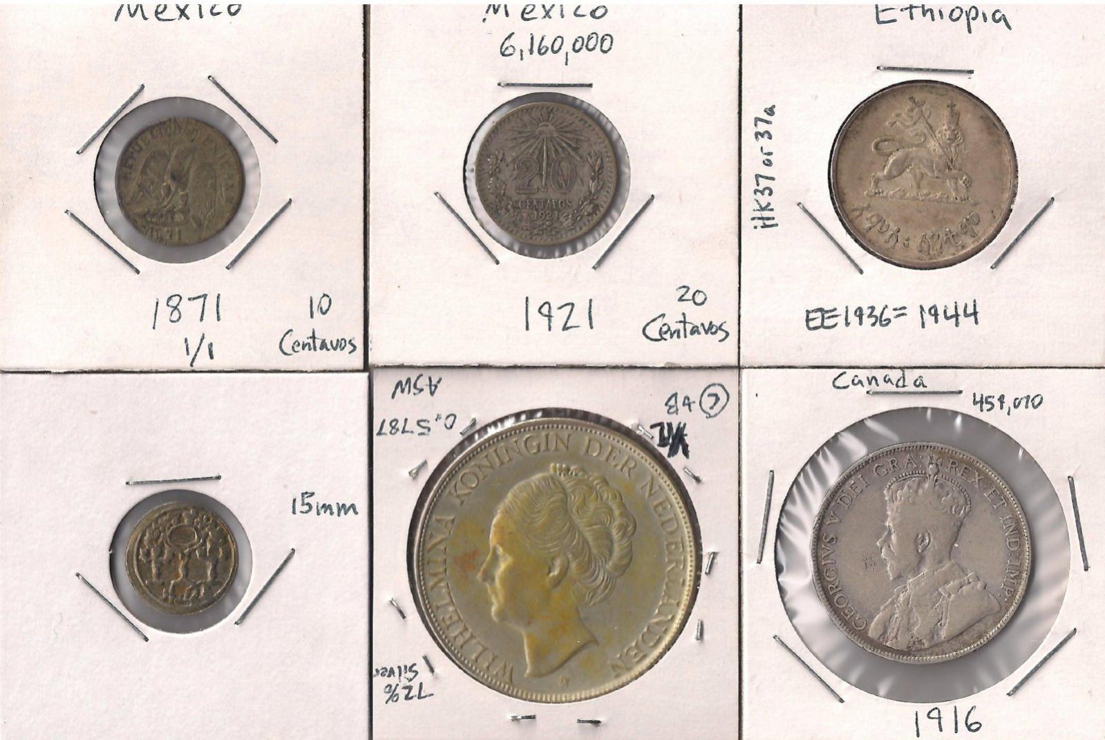 At the same time, I picked up a few other silver minors, including a 1921 Mexican 20 Centavos, a 1916 Canadian 50 cent, a 1944 Ethiopian 50 Cent, a 1944 Dutch Antilles 2.5 Gulden, and a mystery coin that I can't quite pin down. I thought it might be an Afghani 20 Paisa in billion, but that's a pretty big stretch. Anyone have a suggestion for this 15mm coin? It is either very well hammered or a replica of a hammered coin.