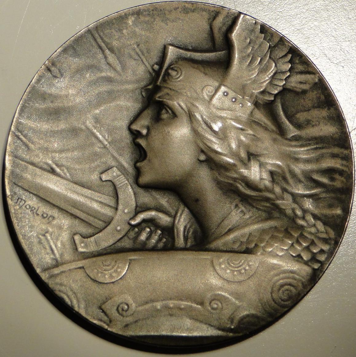 An interesting design indeed, also because of the high relief. :) As far as I can tell, it is a French medal; the signature "A. Morlon" most probably refers to Alexandre Morlon who also designed many French coins. Did a brief search and found this one; so yours may be from roughly the same time - early 1920s - as well.