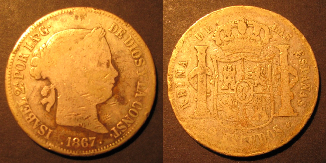 Well it is 25.96 grams, 90% silver, and just about the size of a Peace Dollar. There were 4,234,000 minted in 1867. Oh, and it was minted in Madrid. That's about all I know. :)