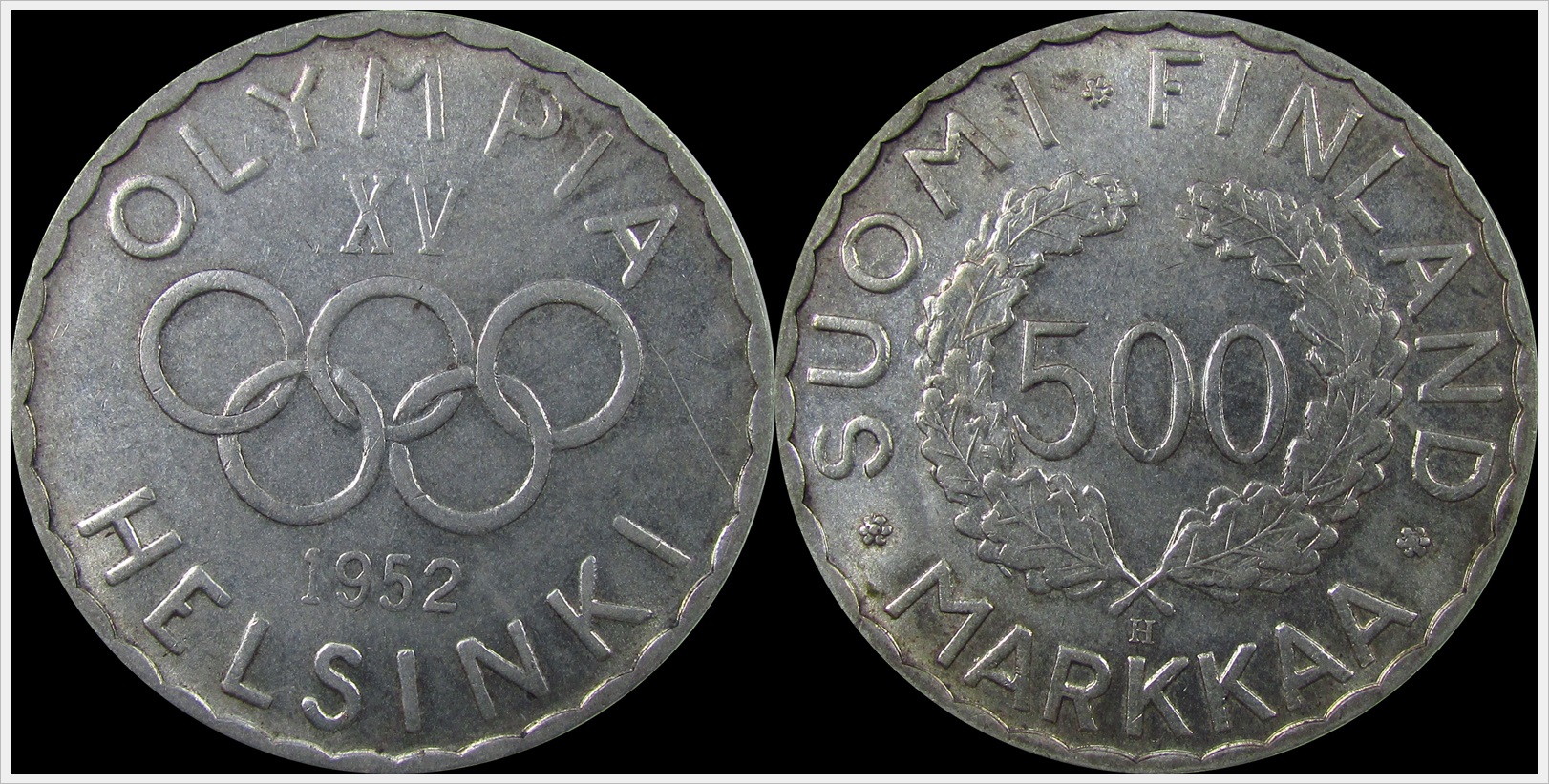 First coin issued for the modern Olympics. 1952 Finland 500 Markkaa. This was a circulating Commemorative coin with a mintage of 586,000. It was over 2000 years prior since a coin was issued for the Olympics.
