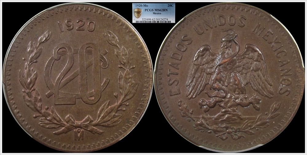 Those that follow my posting know I am a big fan and collector of modern (1905-present) coins from Mexico. This is one of the coins I have been searching for in un-circulated for a long, long time. Finally captured and completed my Bronze 20 Centavos collection. I posted it in another thread, but I wanted to show here also since each thread seems to have different followers and this is my favorite thread in CoinTalk. So please excuse the duplicate posting of this coin.